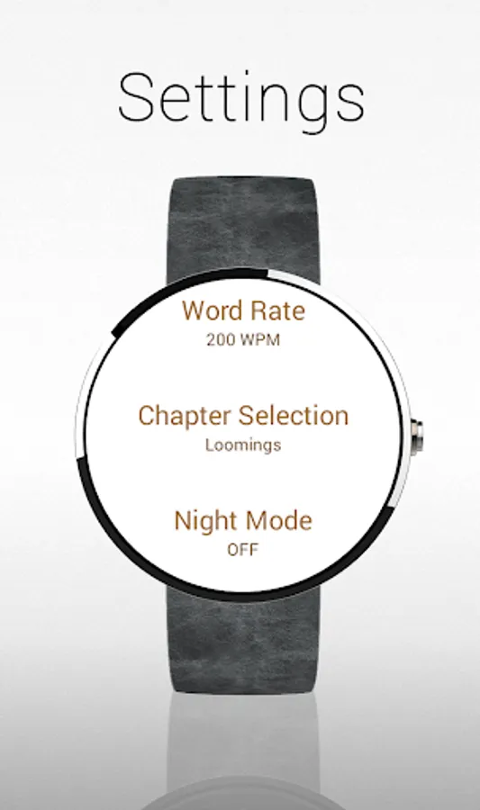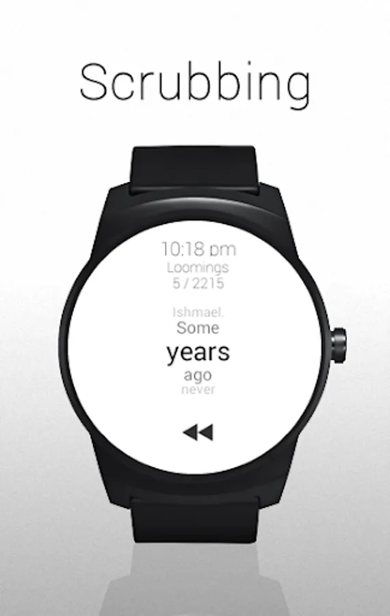 Wear Reader flashes text rapidly on the screen one word at a time to suppress your inner vocalization and allow you to read quickly while still fully understanding the text. Missed a spot and have to go back? No problem! Simply scrub up and down on the screen to rewind and fast forward. Tap to pause the stream to take a break and see how you are doing, and tap again to resume.