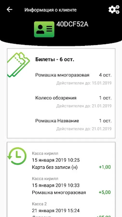 The application allows the Administrator of the facility working on the Lime Ticketing System to view the deposit and debit history on the client card.