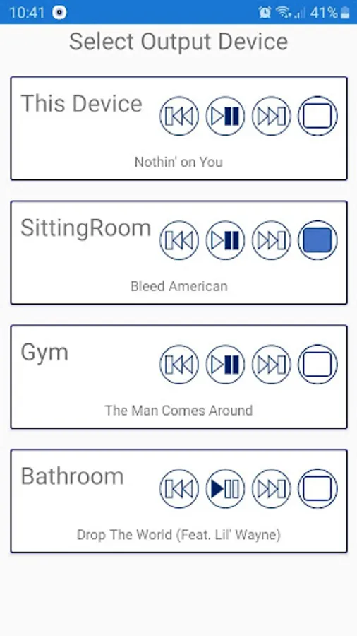 The select output device screen enables quick control of all BlueTunes media players so you can skip/pause/play any BlueTunes media player on the local network all from on screen. Selecting a perticular device will enable you to setup playlist, control the volume and use media player controls within the lock screen.