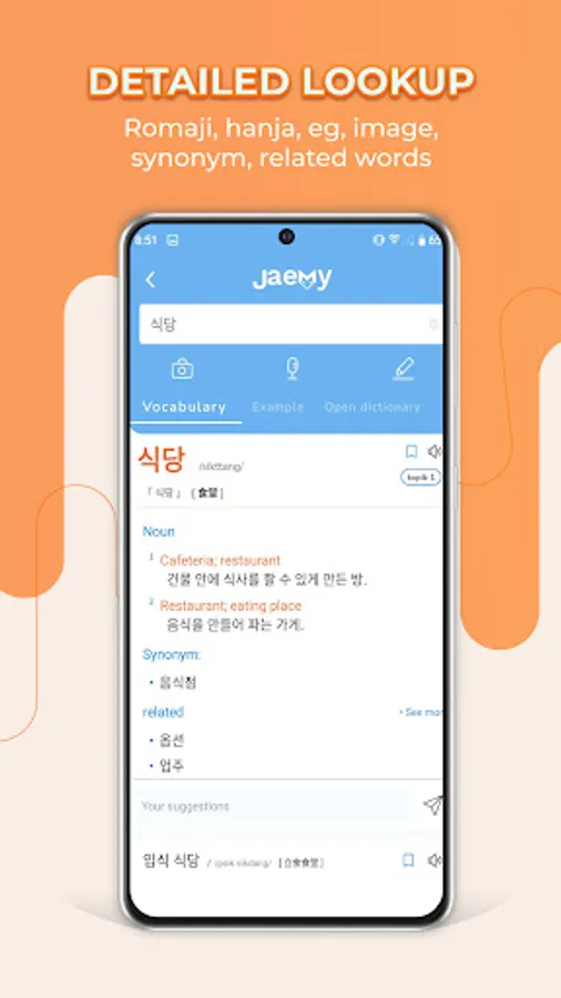 Detailed search results: meaning of word, romaji, audio speaker, word type, detailed explanation in both English and Korean