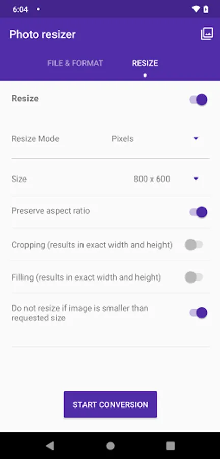 Photo resizer app is photo size reducer app. It allows you to reduce image size. It is complete photo size reducer app that allows you to resize images by different criteria. It has many settings, like resize mode, resolution, preserve aspect ratio, cropping, filling, etc.