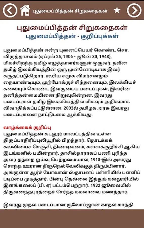 Pudhumaipithan, is one of the most influential and revolutionary writers of Tamil fiction. His works were characterized by social satire, progressive thinking and outspoken criticism of accepted conventions. Contemporary writers and critics found it difficult to accept his views and his works were received with extreme hostility. He as an individual and his works have been extensively reviewed and debated for over sixty years since his death. His influence has been accepted and appreciated by the present day writers and critics of Tamil fiction. In 2002, the Government of Tamil Nadu nationalised the works of Pudumaippithan.