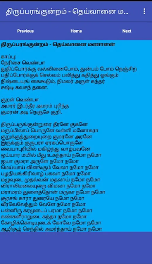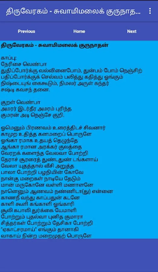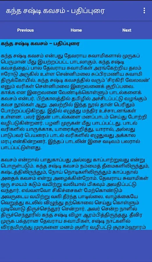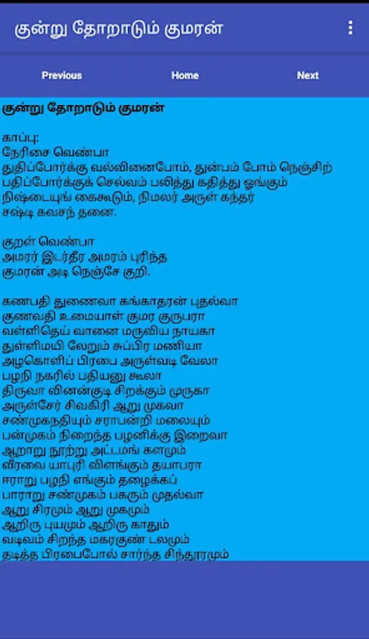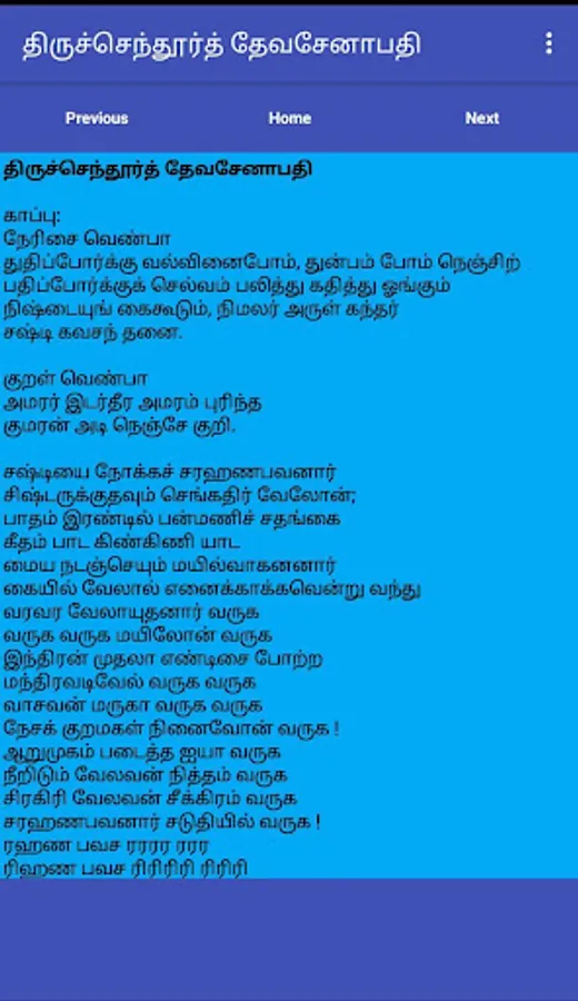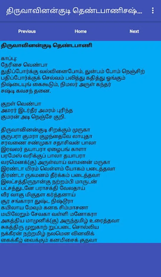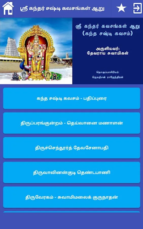 This app consist of all 6 songs written by Devaraya Swamigal and singing all these songs on daily prayer will bring blessings of Lord Murugan.