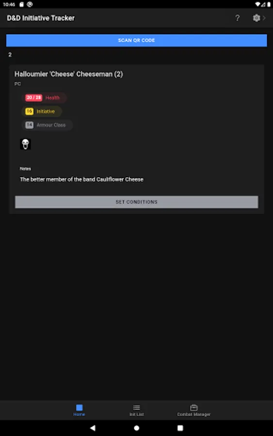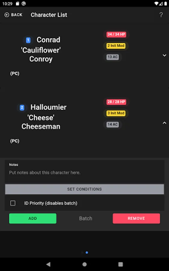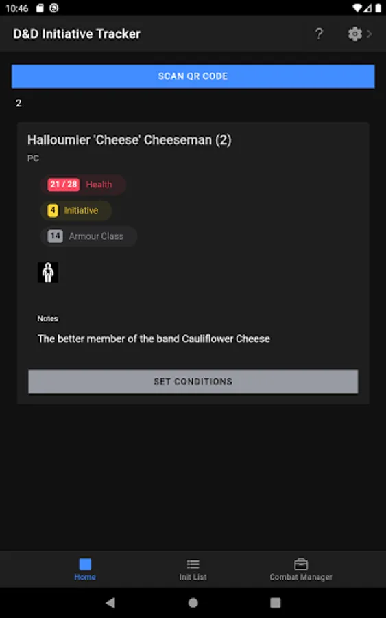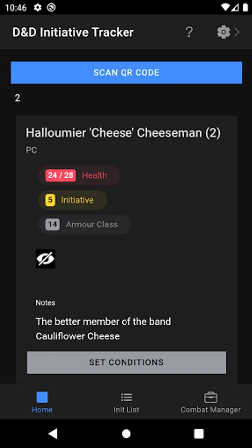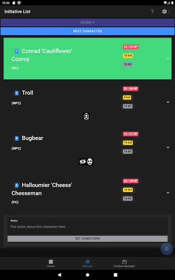 - Health/Max Health, Armour Class, Initiative/Initiative Modifer, Notes, and Conditions can be modified for each character on the fly.