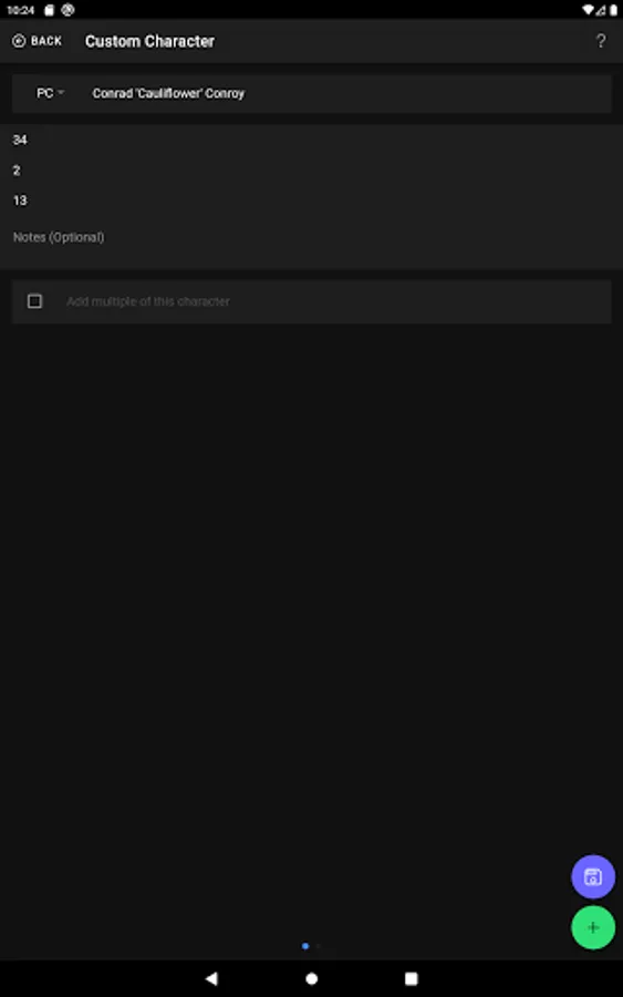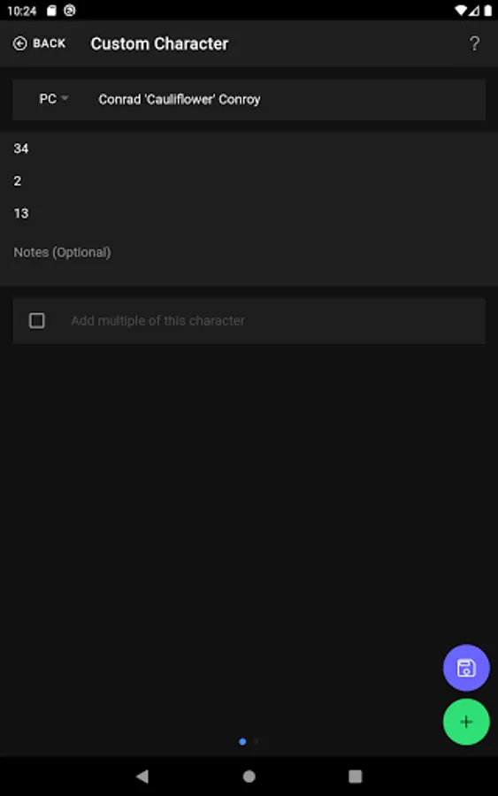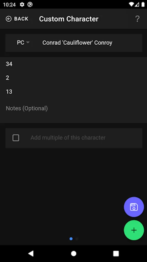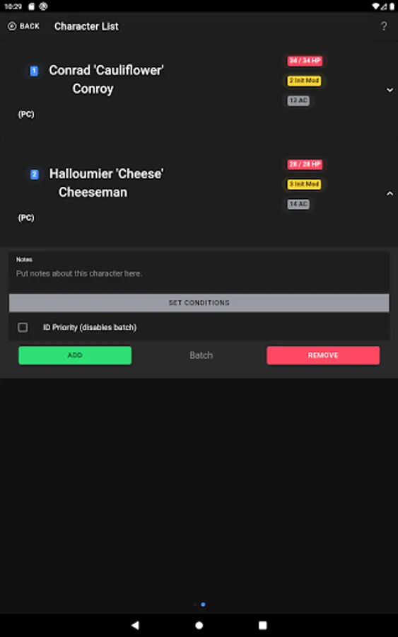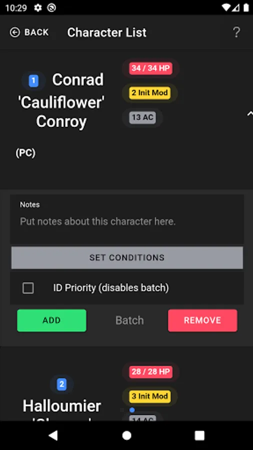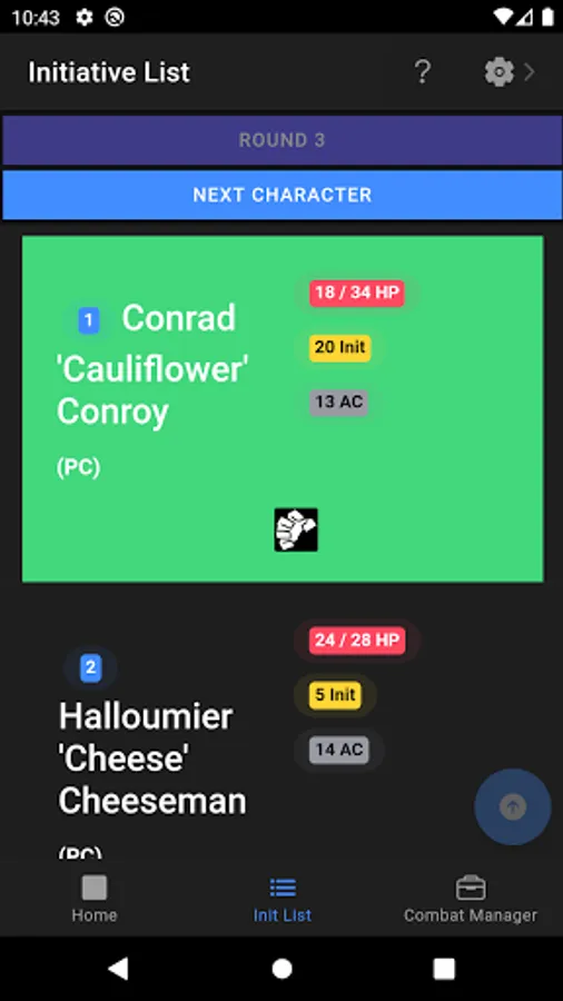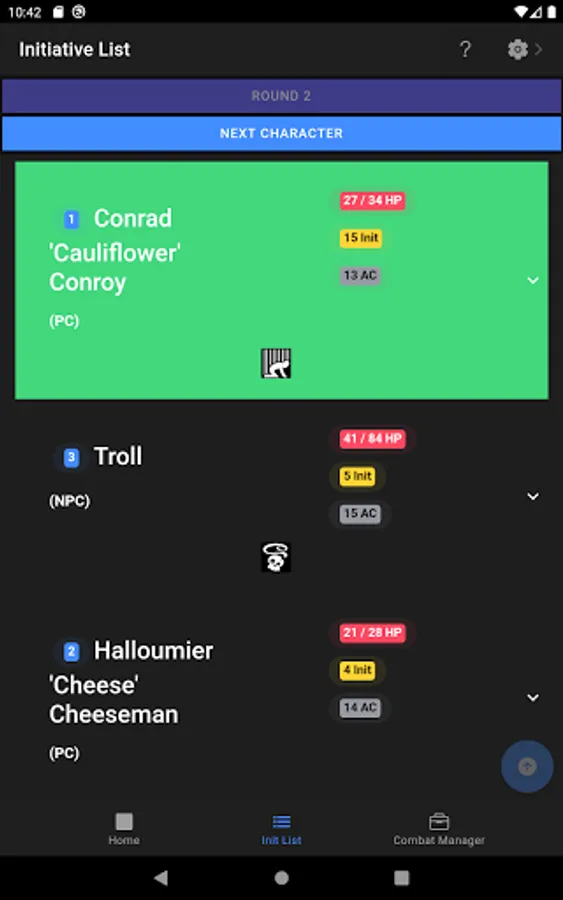 - A Character List where you can save your PCs and NPCs for use in different Initiative Lists.