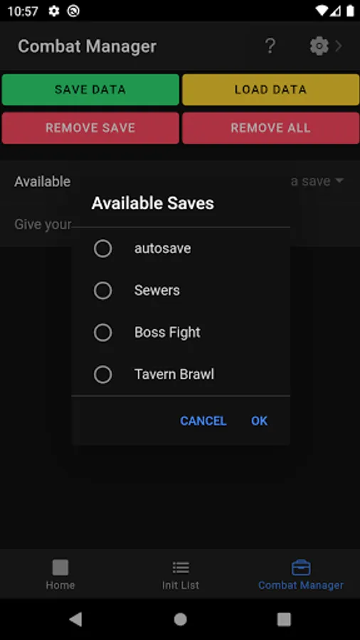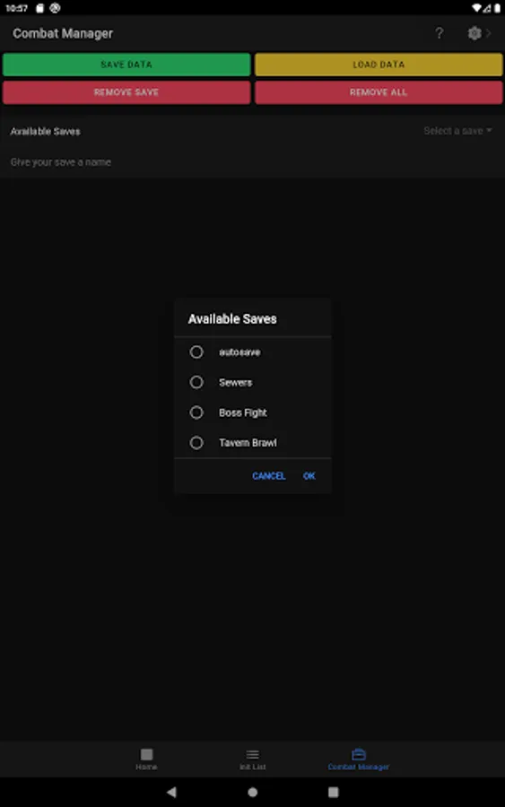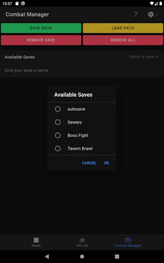 - The Combat Manager, where you can save and load preplanned combat scenarios/resume a fight you had to pause.