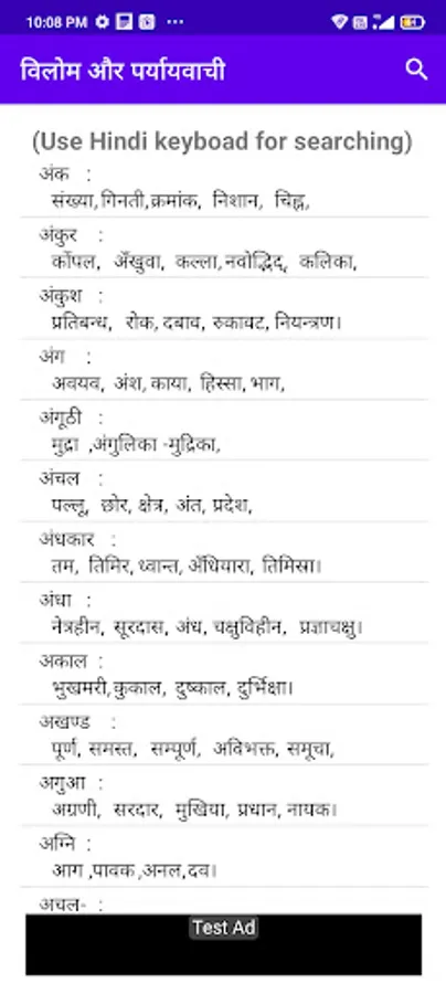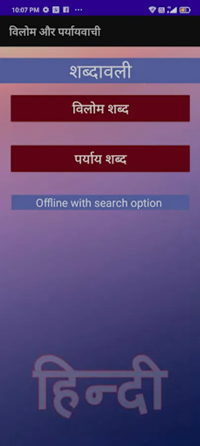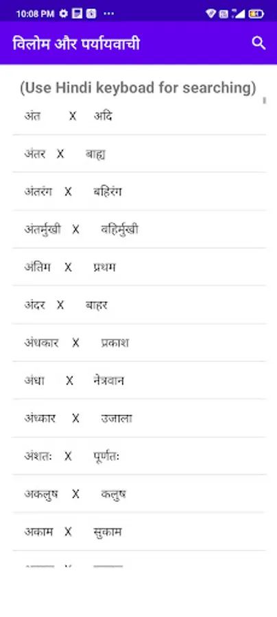 This app is useful for search of Hindi vilom shabd and paryayvachi shabd easily. There are more words are available synonyms and antonyms in hindi. There is offline search option also available to user.
