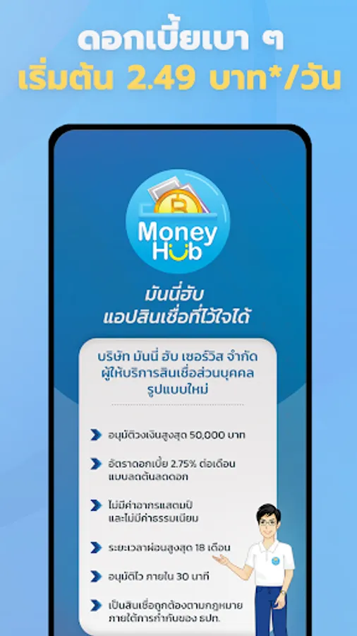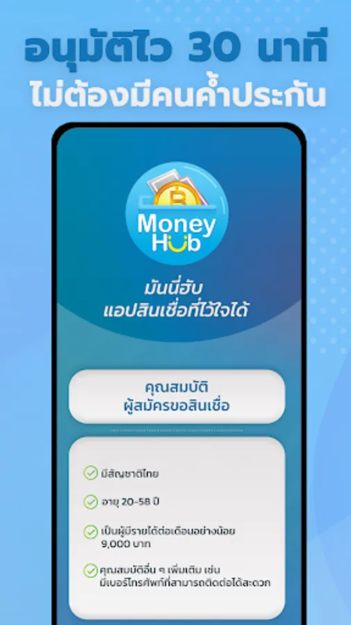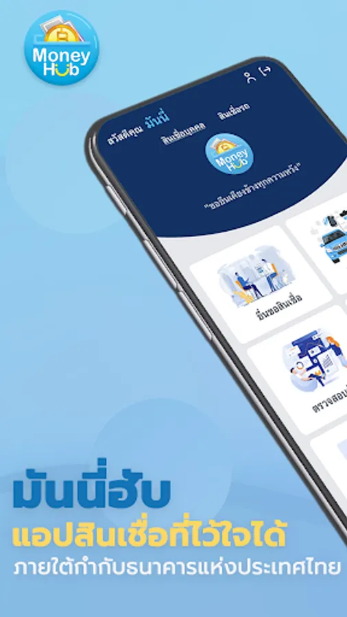 MoneyHub Loans It is a personal loan under the supervision of the Bank of Thailand. This loan is a personal loan for consumption. or occupation which does not require collateral