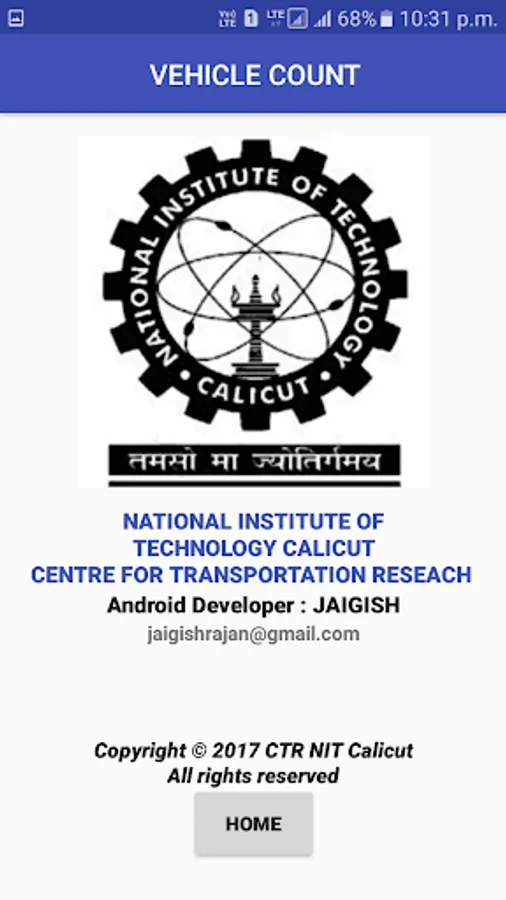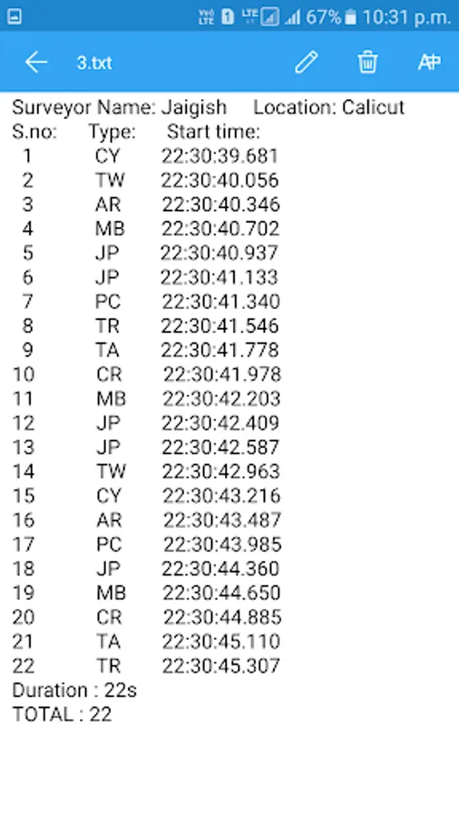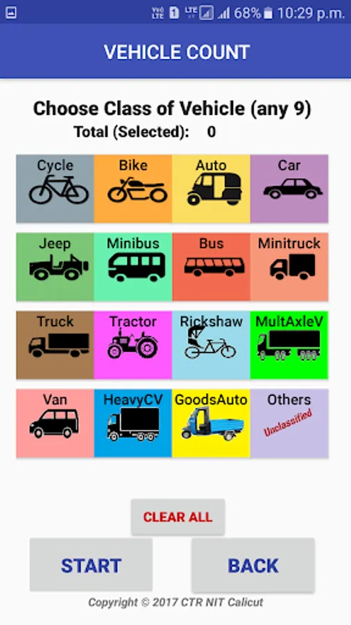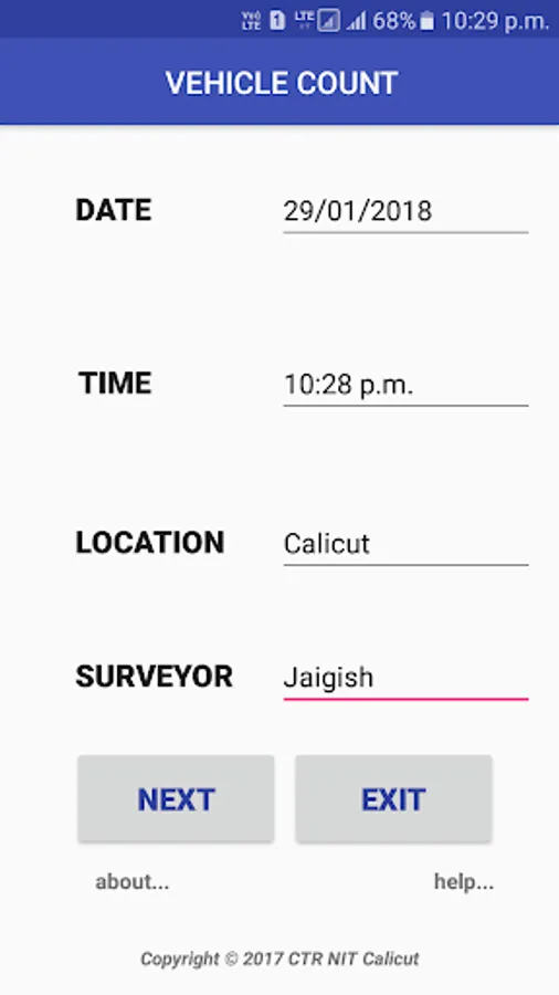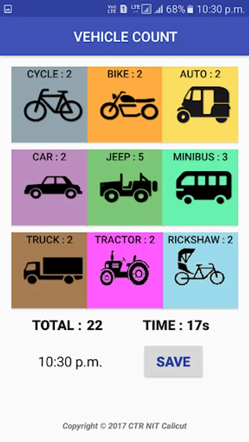 The Vehicle Count Application is used for traffic count. In Vehicle Count, surveyor can specify his name and location then can choose set of vehicles to be included in traffic survey. Real time display of the vehicle count shown at the top of each vehicle type as the user taking survey. The counter stops when surveyor stop survey and on exit, a text file is created on the phone's SD card with vehicle types and their corresponding time.
