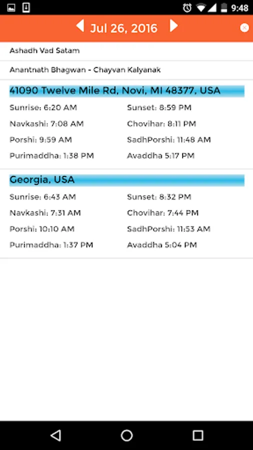 JainTithi is the best way to know tithi details on your mobile device. Features in app include notifications a day before, ability to toggle and filter data you need or feel is relevant for your use, display sunrise, sunset, navkashi, chovihar, porshi, sadhposrshi, purimandha and avadha information based on your location anywhere in the world and for any location you entered. Convenient and user friendly swiping. Easy to add and/or delete locations.
