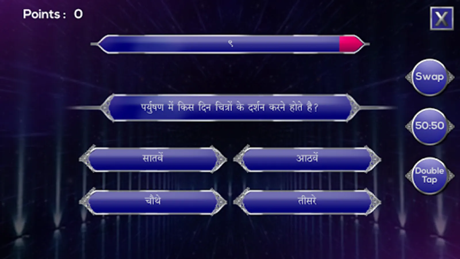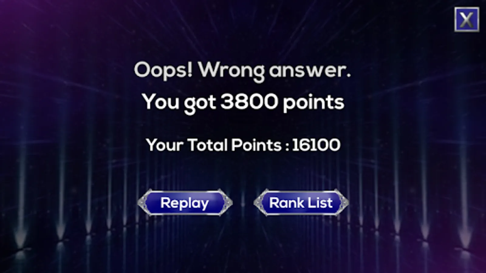 You will be presented with set of 9 questions. There are 3 life lines as well. You can score marks based on how fast you answer the questions and with or without use of life lines.
