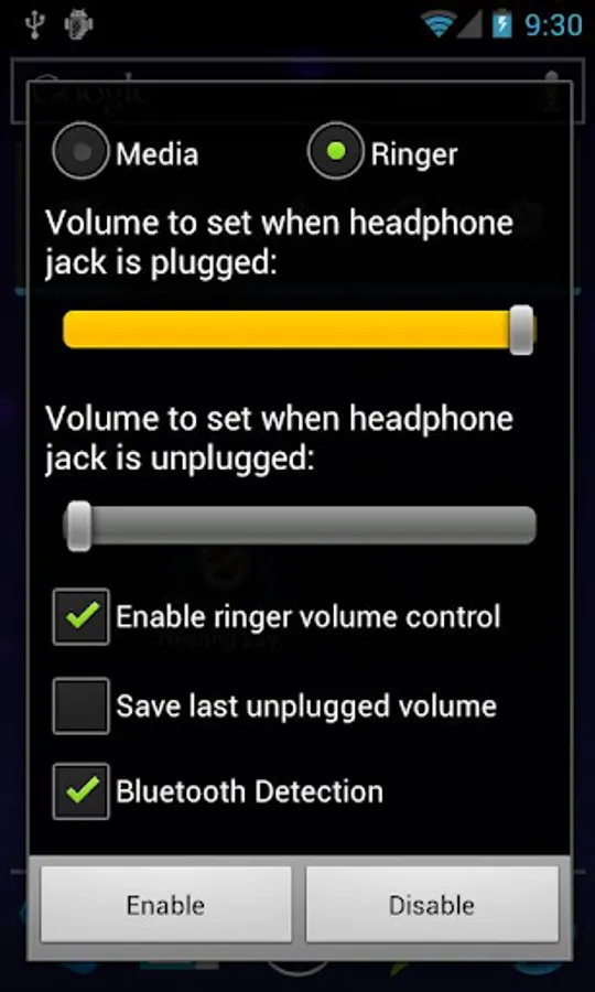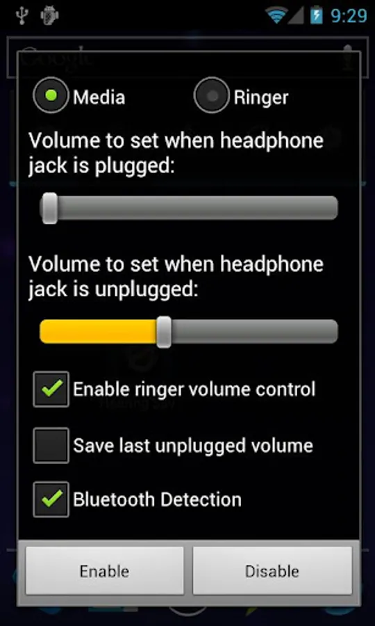 - Media/Ringer Selector Buttons - These allow you to select what the two sliders, described below, control. If you have not enabled Ringer volume control, the Ringer radio button will be disabled.