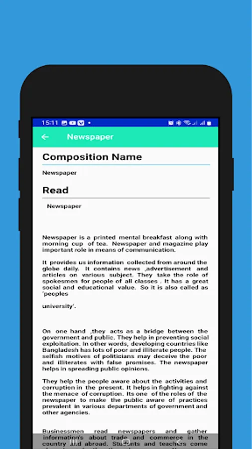 পি এস সি, জে এস সি, এস এস সি, এইচ এস সি ইংরেজি ইংরেজি প্রথম পত্র ২য় পত্র পরীক্ষায় ইংলিশ Composition আসে আর সেখানে ১০ নম্বর থাকে Composition রাইটিং বিষয়ে। ইংলিশ ১ম পত্রের অংশ বা শাখা হচ্ছে ২য় পত্র। অনেক সময় পরীক্ষায় যে Composition গুলো আসে তা সব বই পুস্তকে খুঁজে পাওয়া কষ্টকর হয়ে পরে তাই আমরা সব গুলো Composition একত্রে সংগ্রহ করে রেখেছি। বিশেষ করে যারা ইংলিশ গ্রামার বিষয়ে দুর্বল তাদের জন্য খুবই helpful হবে অ্যাপটি। কারণ Composition ওয়ার্ড গুলো খুব সহজ শব্দে লেখা, যা ছাত্র ছাত্রীদের পক্ষে মনে রাখা খুব সহজ হবে ইনশাল্লাহ।