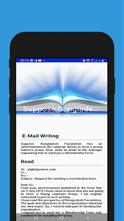 English E-Mail Writing ইংরেজি E-Mail Writing অ্যাপটি অষ্টম নবম দশম শ্রেণী কিংবা যারা ssc এস এস সি পরীক্ষা দিবে এবং একাদশ দ্বাদশ শ্রেণীতে পড়ে অথবা hsc এইচ এস সি পরীক্ষা দিবে তাদের জন্য খুবই উপকারী হবে এই অ্যাপটি। এছাড়াও যারা বিভিন্ন চাকরির পরীক্ষা দিয়ে থাকেন এবং বি সি এস দিবেন তাদের জন্যও খুবই সাহায্যকারী হবে।