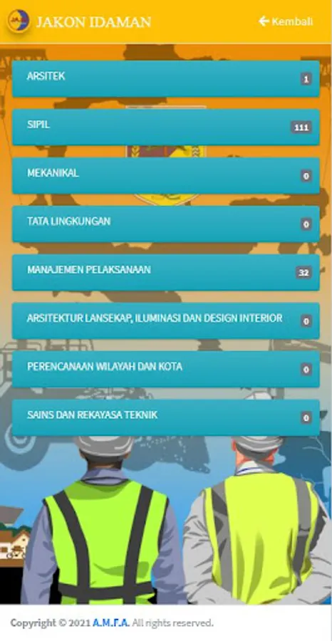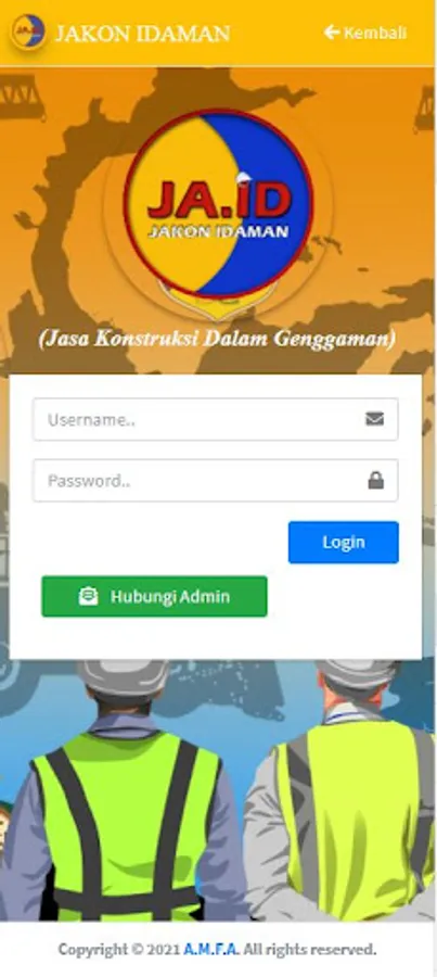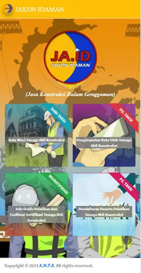 We from the Development and Construction Services and Construction of Central Sulawesi Province developed a web and android-based application, namely JAKON IDAMAN (JA.ID) which aims to make it easier for the construction service community to get information on construction experts in the Central Sulawesi province anytime and anywhere you are.