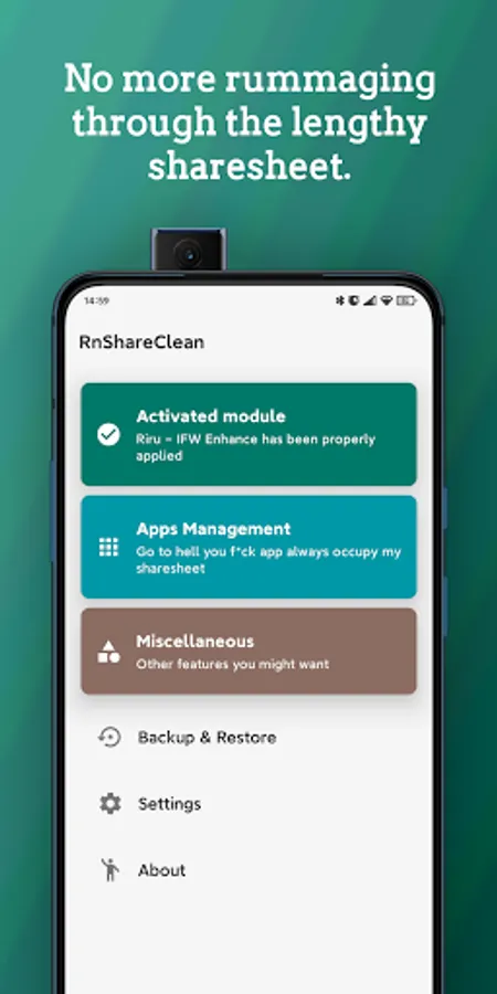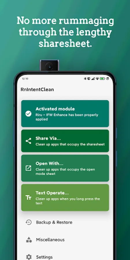 RnIntentClean is an App that allow you to clean up your sharesheet and open mode sheet, which works with the Magisk modules "Riru-Core" and "Riru-IFW Enhance", and root permission.