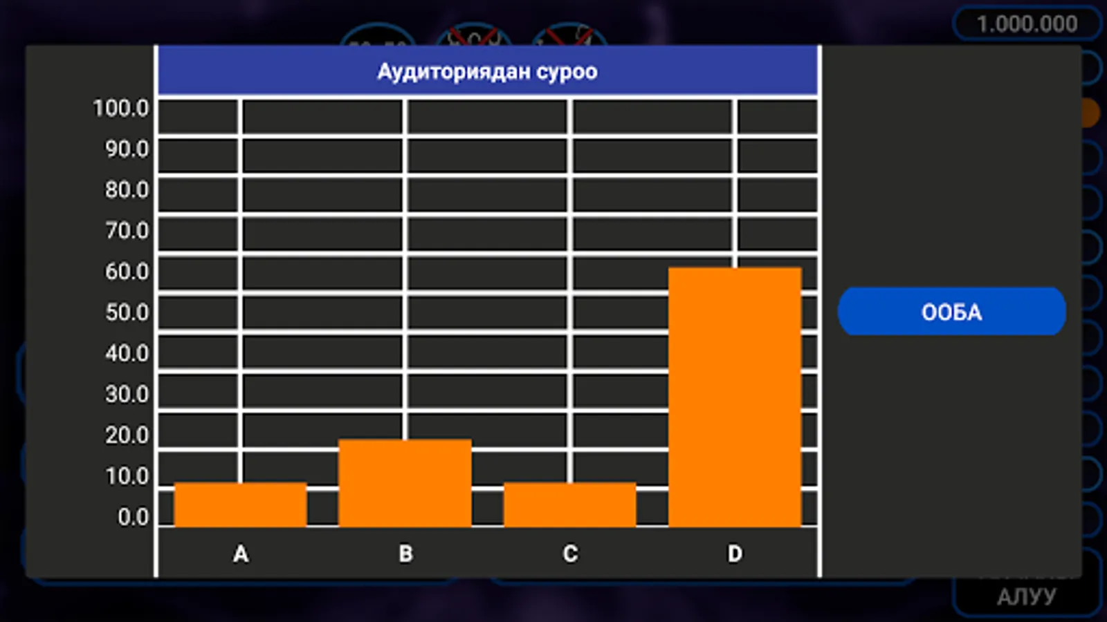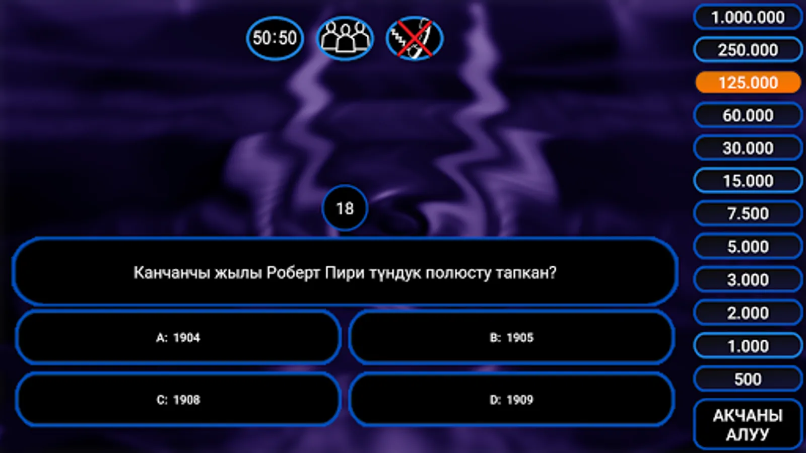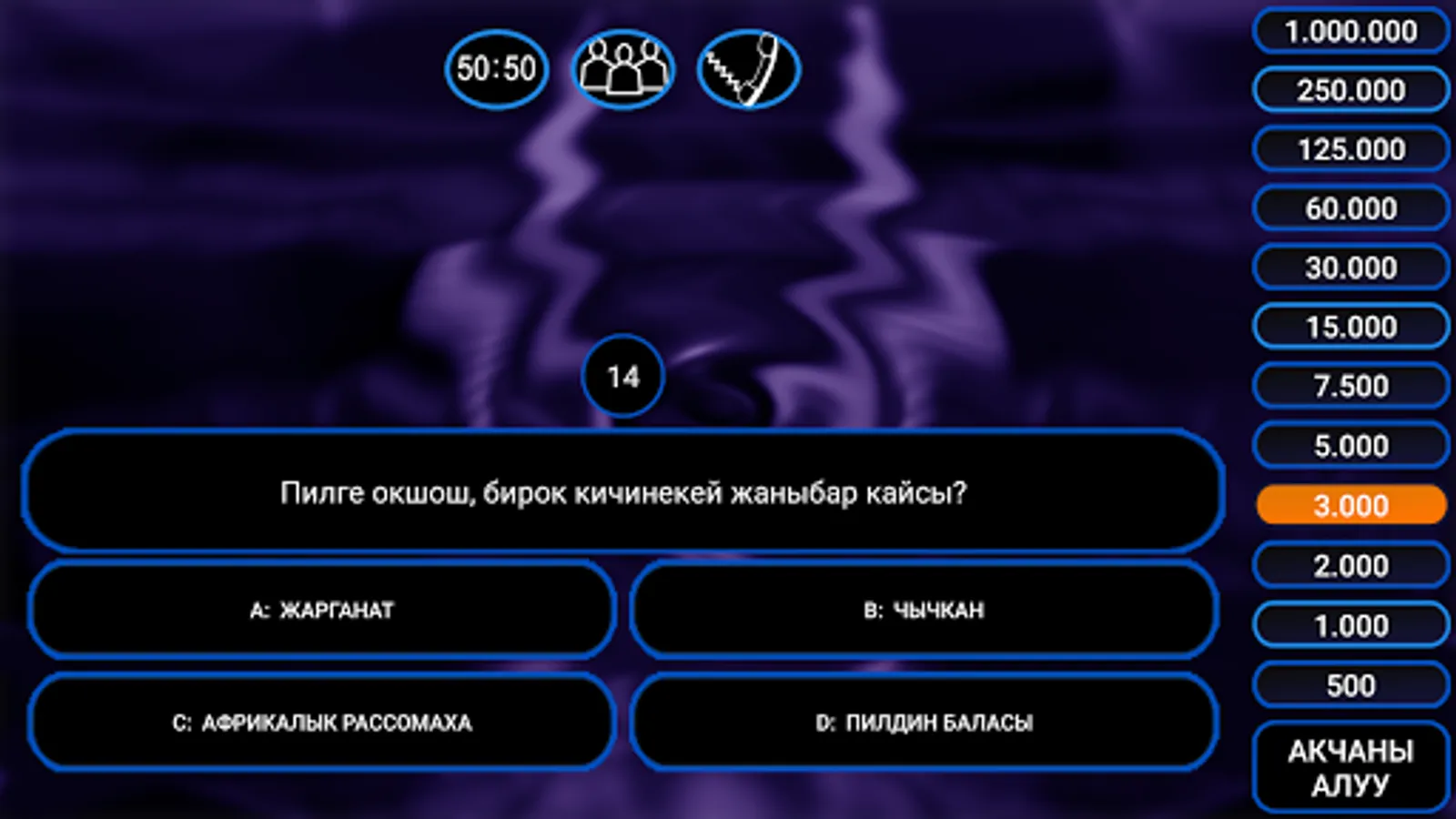 Test your knowledge in their native Kyrgyz language, more than 100 different questions to different temy.Uluchshay their knowledge and become a millionaire