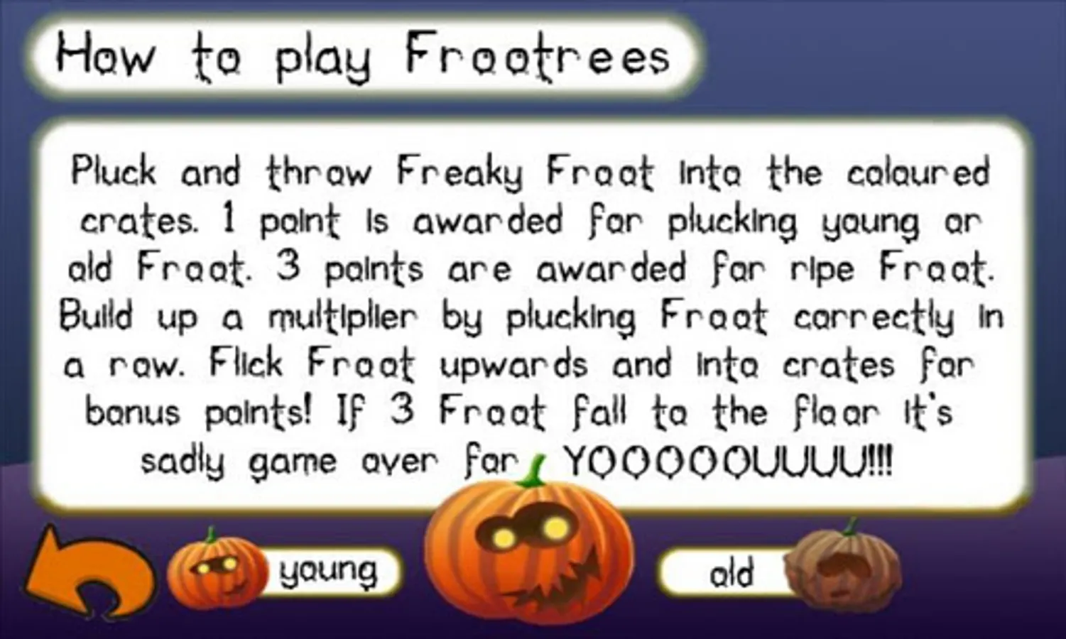 Pluck freaky Froot from the Frootree & place them in the correct crates. It's not as easy as it looks though with multipliers to boost your score. Can you master the infamous Frootrees upward flick?
