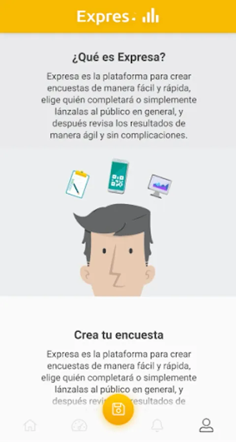 Expresa is a mobile app complement for a Cosmic Latte organization account. It allows users within the organization to fulfill data collection flows and access their questionnaire inbox.