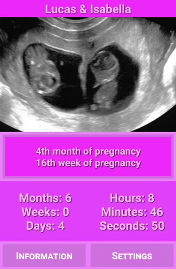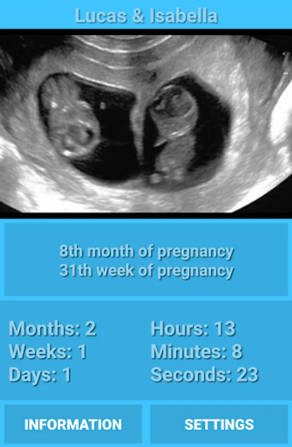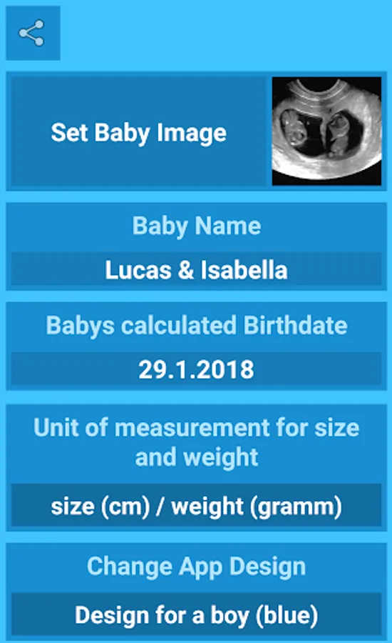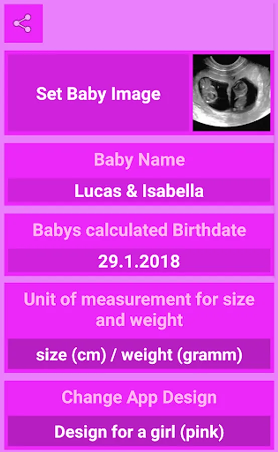 If you have already received an ultrasound image, you can also save it in the app and display it in its app Home. Also the future name of the baby or babies can be set and displayed on the main page.