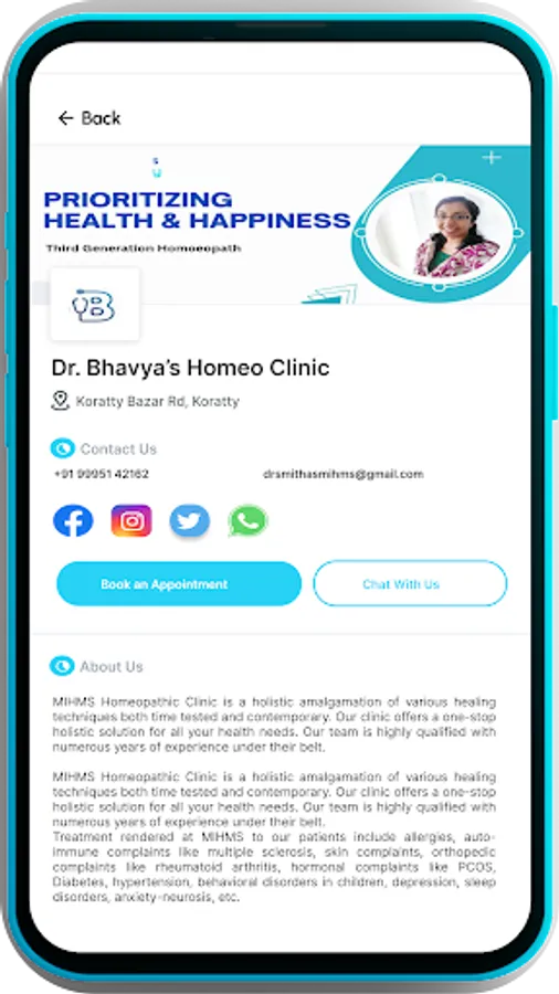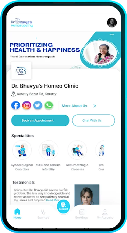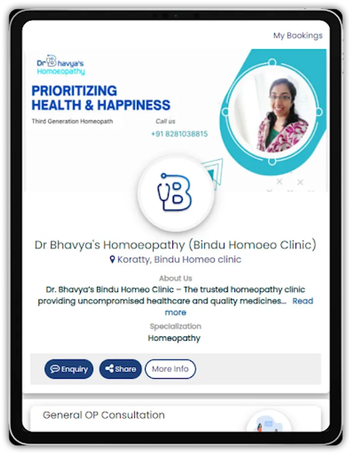 Having practiced under senior homeopath Dr Raveendranath at Bindu Homeo Clinic, Dr Bhavya was entrusted with the charge of the clinic upon his demise in 2013.