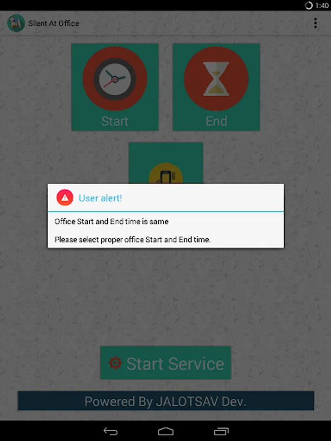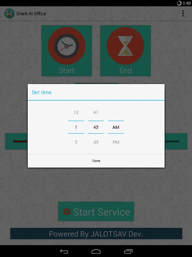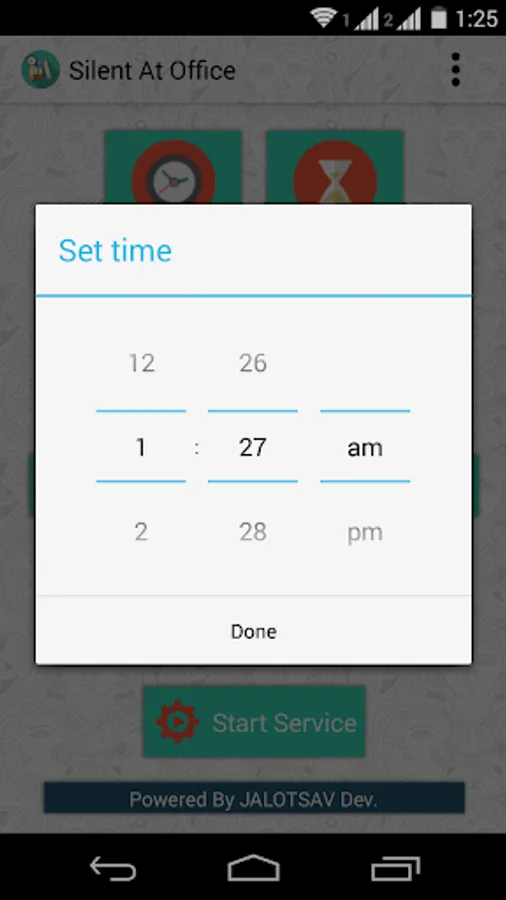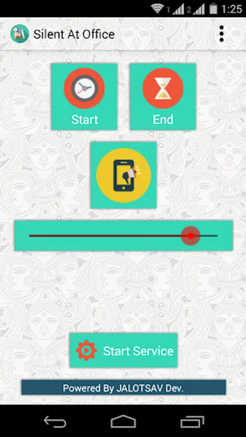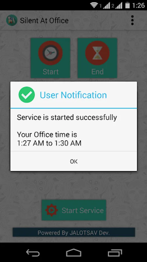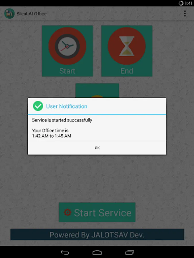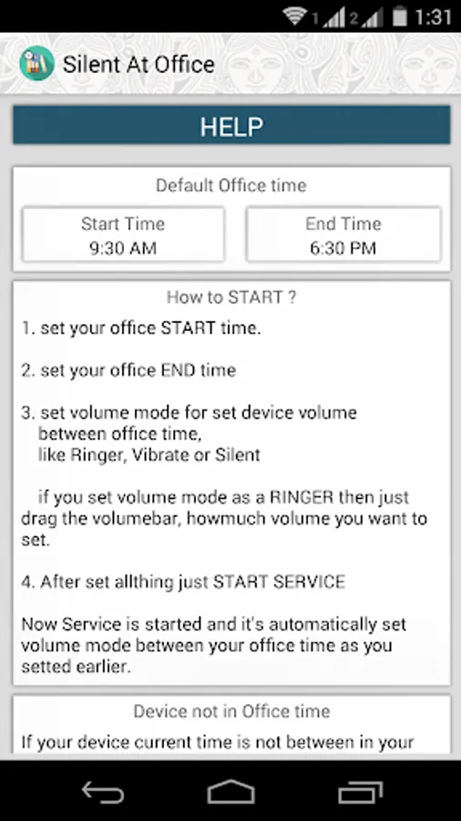 After that just start the service, when ever your device current time is in between your office start and end time it's automatically set the ringer mode and volume as per you select earlier.