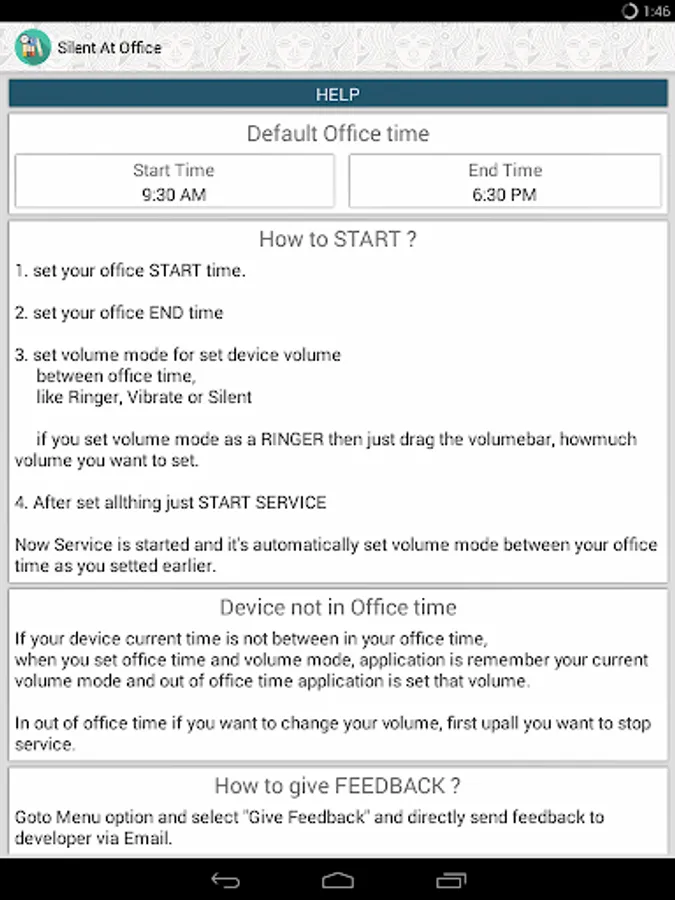 Silent At Office application is use for, if you want to set your device volume for particular office time.