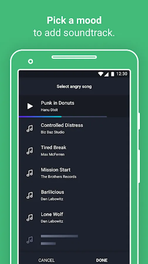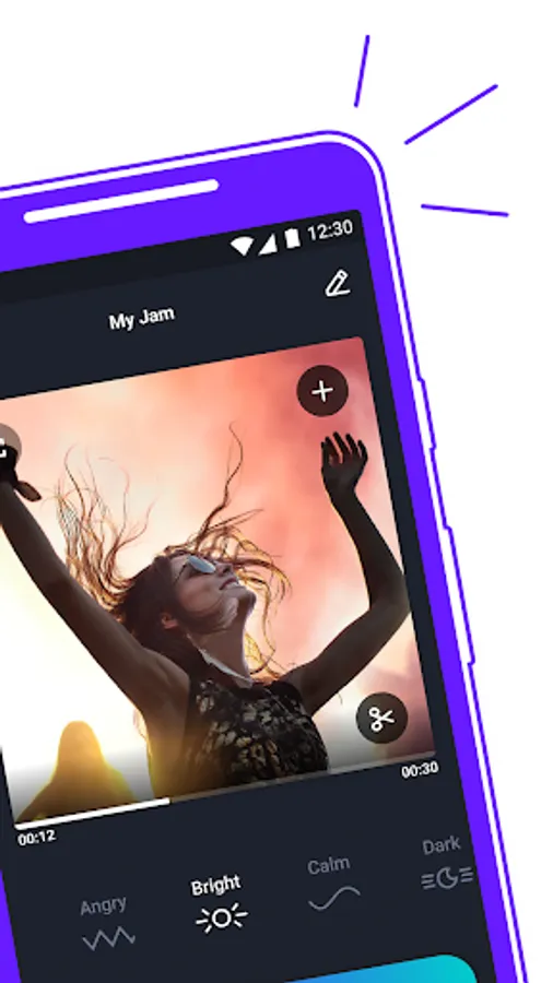 Wish to add music to video? Pick a soundtrack from JamVideo royalty-free library simply by tapping one of the moods (Bright, Dark, Dramatic, Happy, Inspirational or Romantic), and the app will automatically sync video to the beat of selected music.