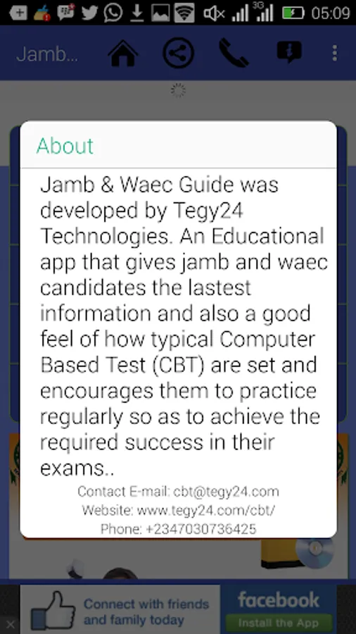 Disclaimer: Most of the content/information on this App are gotten from research on the internet. It was developed by a team willing to provide useful information to jamb and waec candidate without going through much stress sorting for information. For any help/inquiries/suggestion please mail me at cbt@tegy24.com or call +2347030736425
