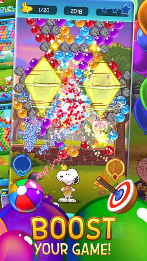 Match your way through challenging puzzles and harness the power of the Peanuts friends in this free Charlie Brown puzzle journey! Test your skills and blast bubbles to unlock rewards and prizes! In this classic bubble shooting game, Snoopy, Charlie Brown, and the Peanuts friends will push your skills to the limit! 📈