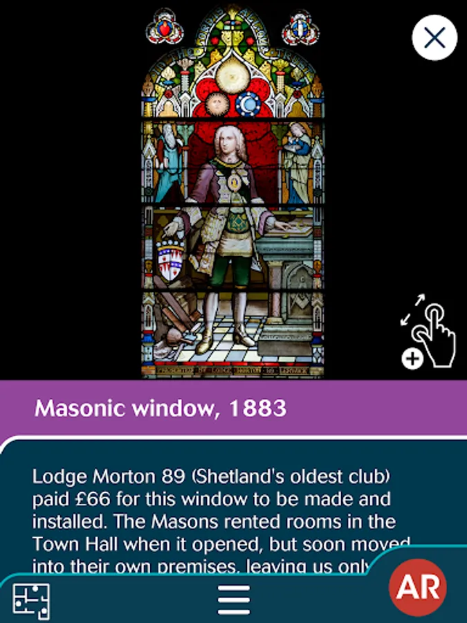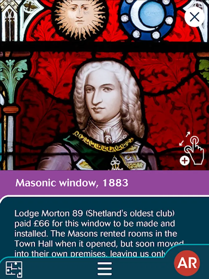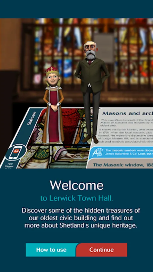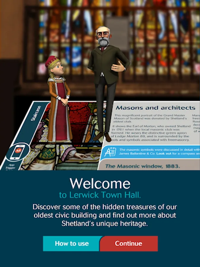 Busy, beautiful and much loved, Lerwick Town Hall has been at the centre of Island life for more than 130 years. With this app you can explore the Town Hall and, with Augmented Reality, meet virtual tour guides, seven year old Margaret, the Maid of Norway, and Arthur Laurenson, the man behind the magnificent stained-glass windows, who will guide you through Lerwick’s colourful history as depicted in the beautiful windows in English and Norwegian.