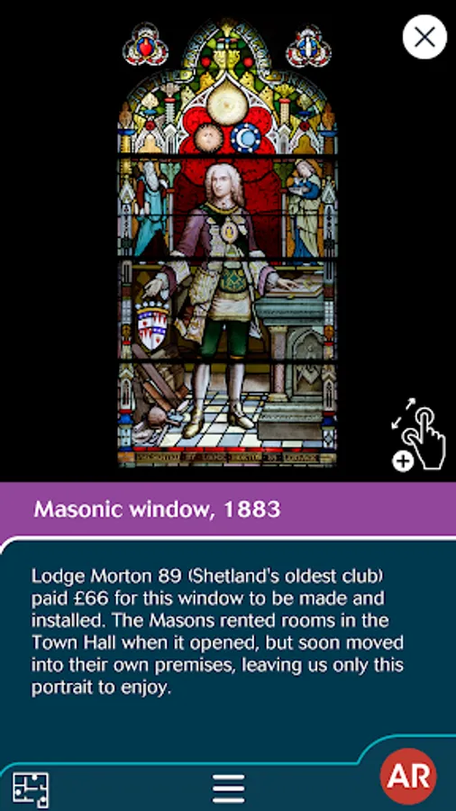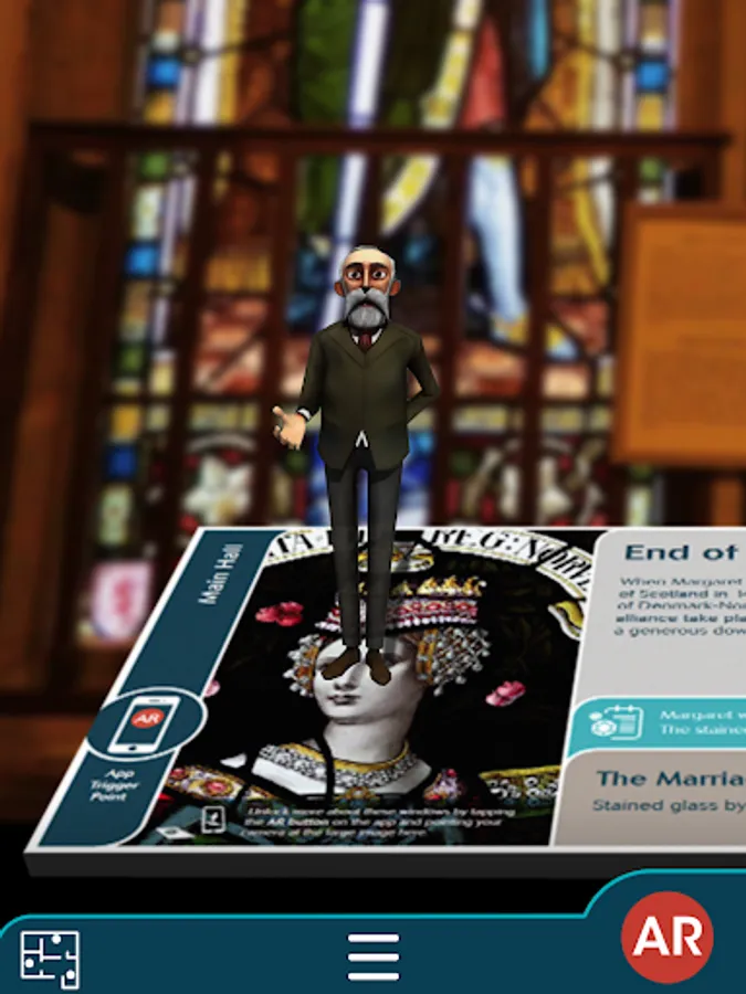You’ll need to visit the Town Hall to unlock the information. When you get there look out for the AR icons on the interpretation panels around the hall, tap the AR button, point your mobile device at the panel to meet Margaret and Arthur and unlock more about each of the windows and the history of the Town Hall.