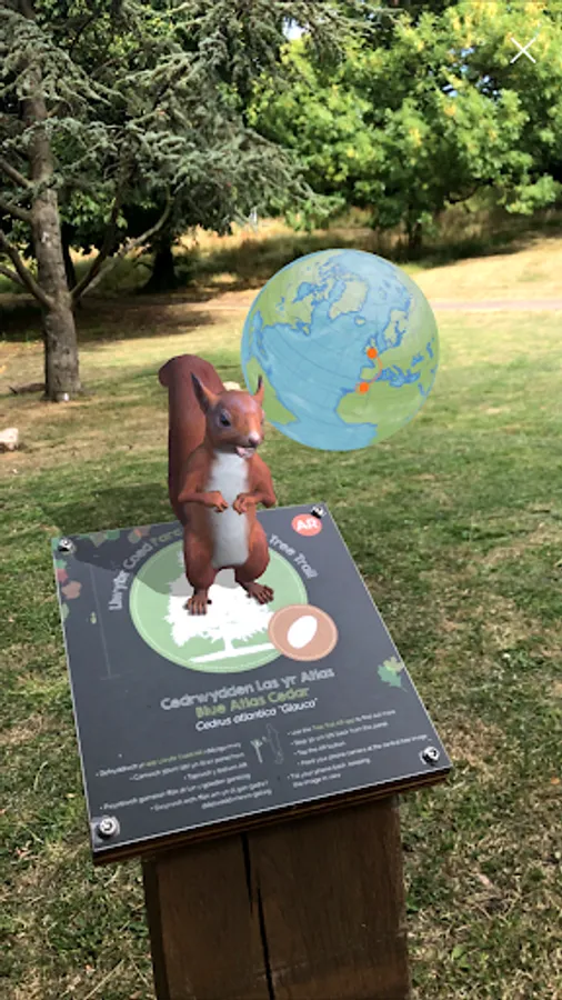 When you arrive at a tree, look out for the round AR icon on the tree's panel, tap the AR button and point your mobile device at the panel to meet Cyril the Squirrel in Augmented Reality and unlock more about each of the trees.