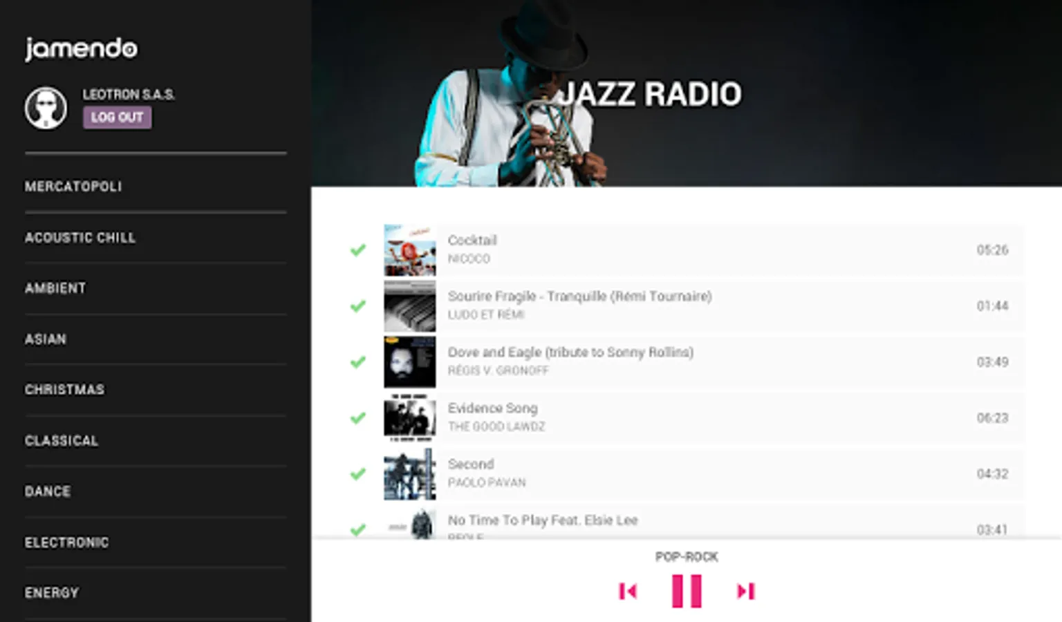 The Jamendo Instore Radio Player allows you to broadcast more than 30 royalty free radio stations in any public place. The music available through the app has been handpicked by Jamendo's team of music specialists, in order to fit any venue including bars, restaurants, shops, franchises, hotels, beauty salons...