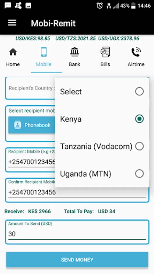 The app also allows you to pay bills and send airtime to Kenya mobile and can be used from anywhere in the world.
