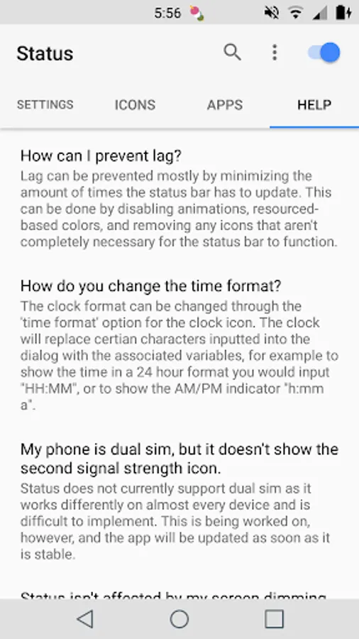 Status is a status bar replacement that draws an overlay on top of the system-generated status bar. This means that the actual status bar is only hidden under the replacement; touch gestures are not overridden, and the standard notification panel is still shown. It needs a lot of permissions in order to obtain the information needed to display in the status bar. These are listed below.