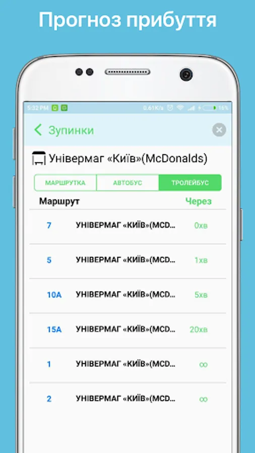 To supplement received information about where you are and determined to the nearest stop you must enable GPS. Then click on the image stops at the top left of the screen. From the list, select the desired stop. After that, the application will show you a list of all taxis, buses and trolley buses, which will soon come to a stop and this time their expectations.