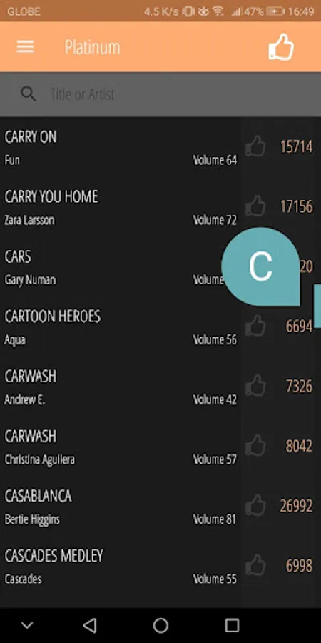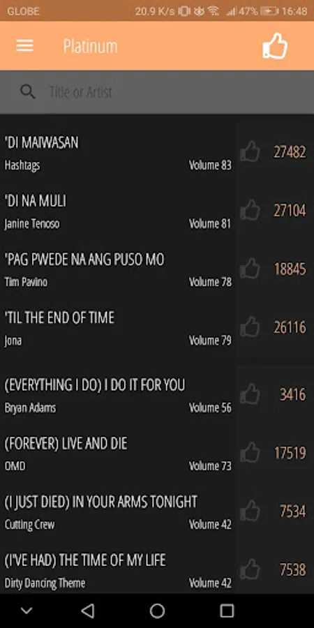 Search song titles and artist name. No need to complete it, just a part of the title or name will do.