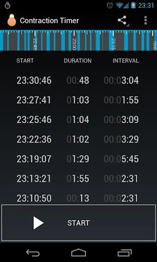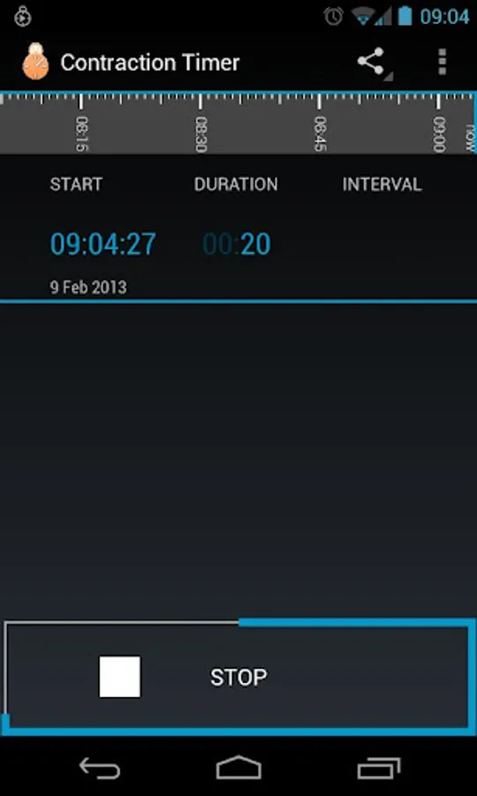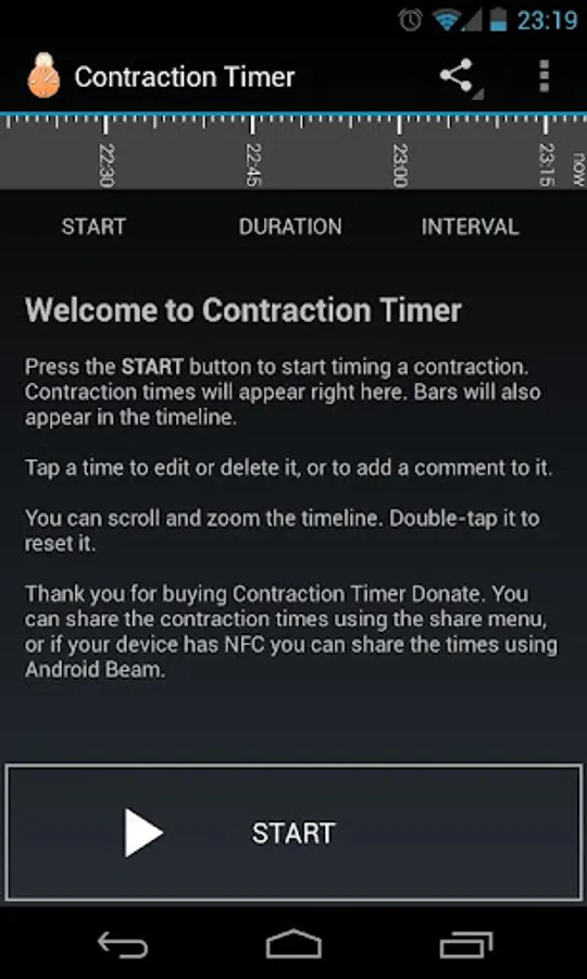 Please purchase Contraction Timer Donate if you like this app. It also enables the ability to share your times in an emailed spreadsheet, and also enabled the Android Beam feature (Android 4+ phones with NFC only), so that you can instantly beam your times to another device—particularly useful when your partner comes home from work and takes over the timing operations!