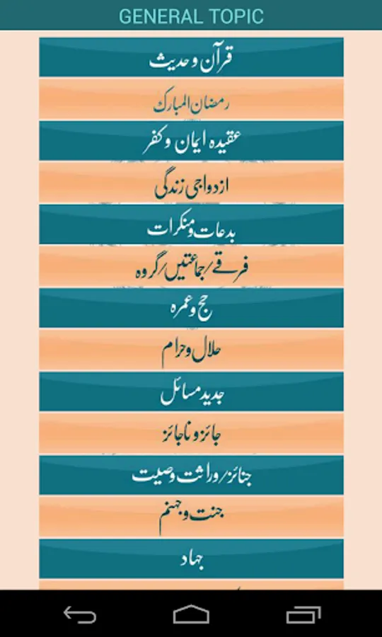 The topics are categorised into sections for easy navigation (e.g. Quran o Hadees, jannat o jahanum, bidaat o munkarat, etc.), also provides the functionality to 'bookmark' the topics of interest for a handy reference.