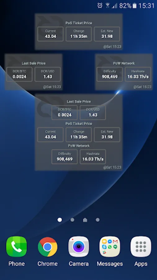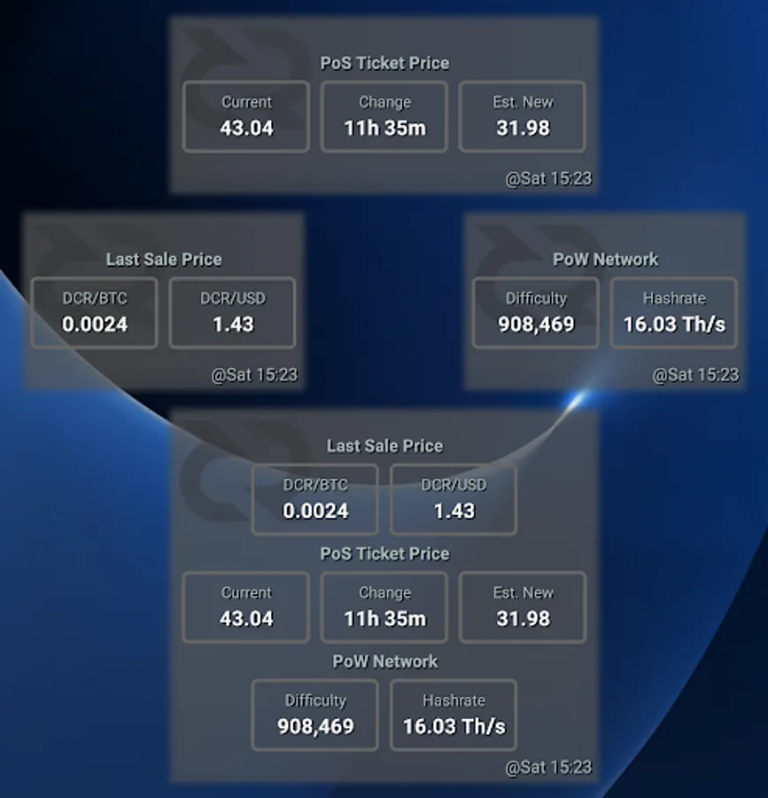 Home screen widgets providing a quick view of the value of Decred and essential statistics for the Decred network. The widgets include: