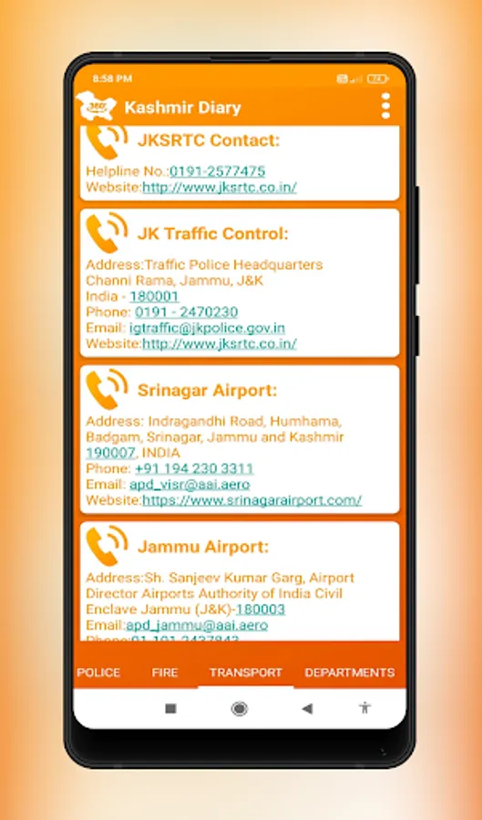Get offline access to important phone numbers,email addresses & websites from Jammu and Kashmir.