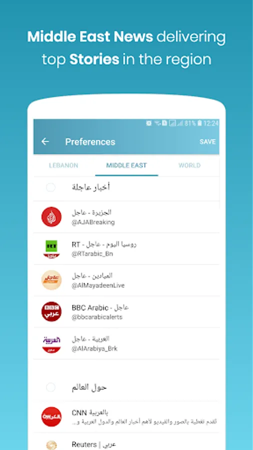 ○ Middle East: Al-Mayadeen, Al-Arabiya & Al-Jazeera News, BBC News & CNN in arabic, Asharq Al-Awsat & AlQuds newspapers, etc.