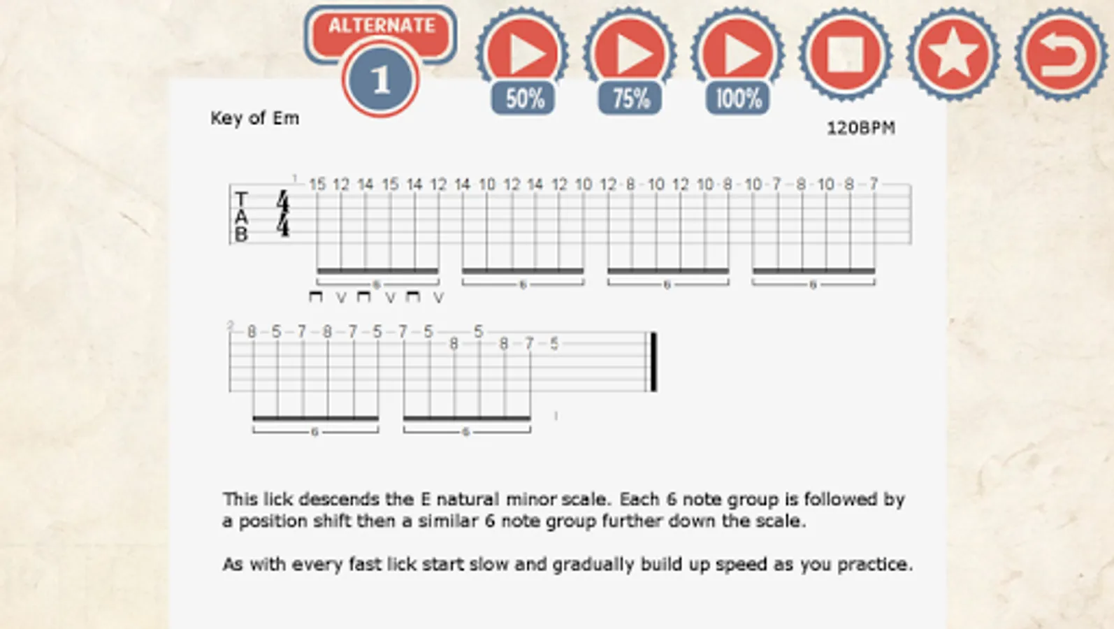 ● Licks use techniques like alternate picking, sweeping picking, tapping, legato and more.