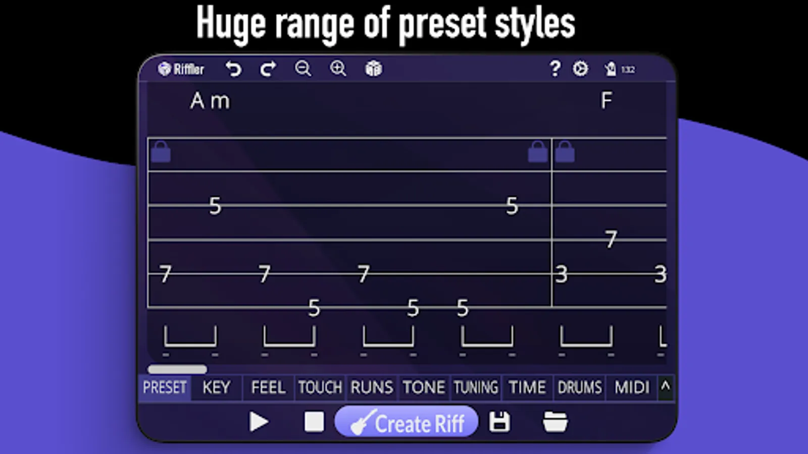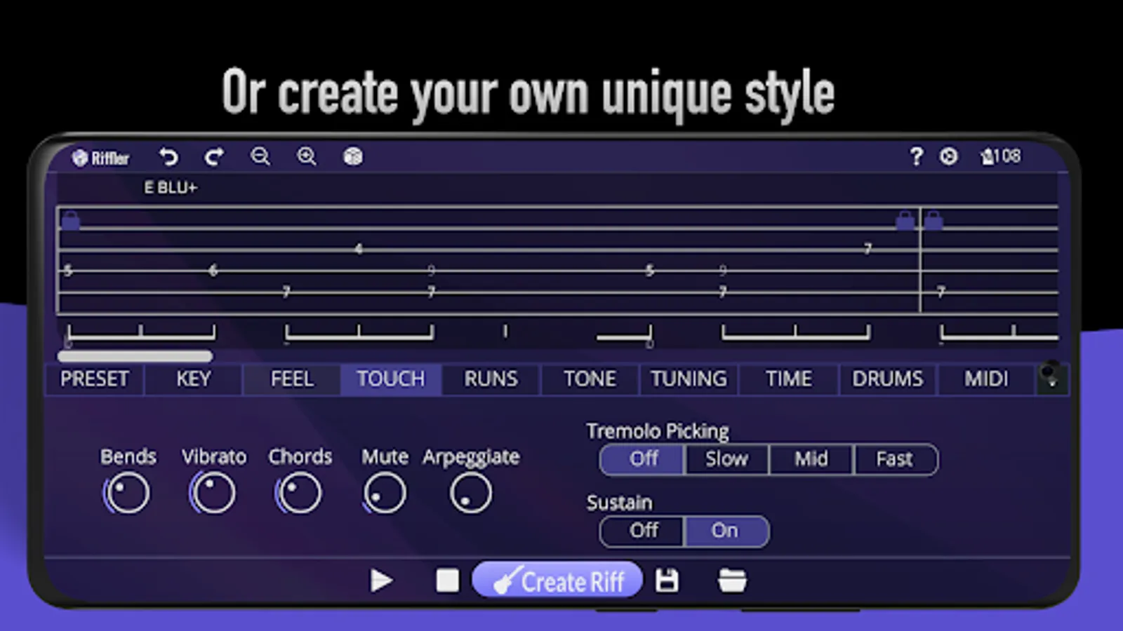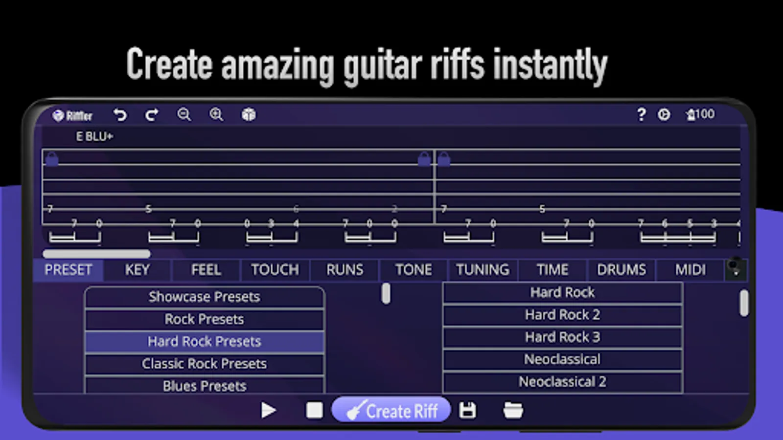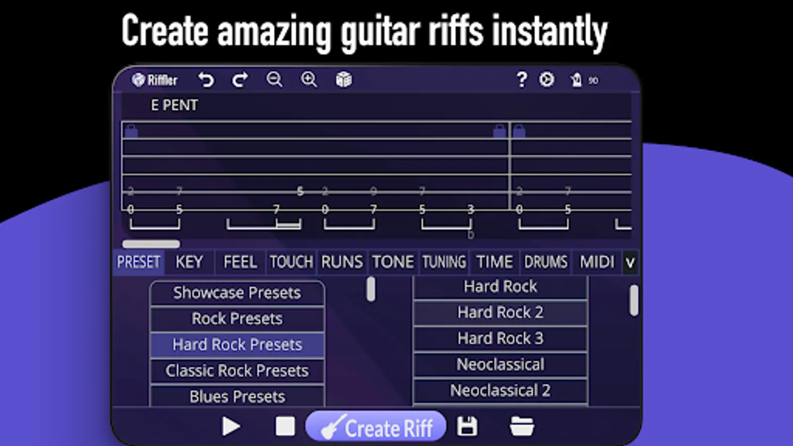 The easiest way to get started is to select from the huge list of preset musical styles, tap "Create", and a unique guitar riff will be made. The created riff is displayed as guitar tablature which you can listen to and save.