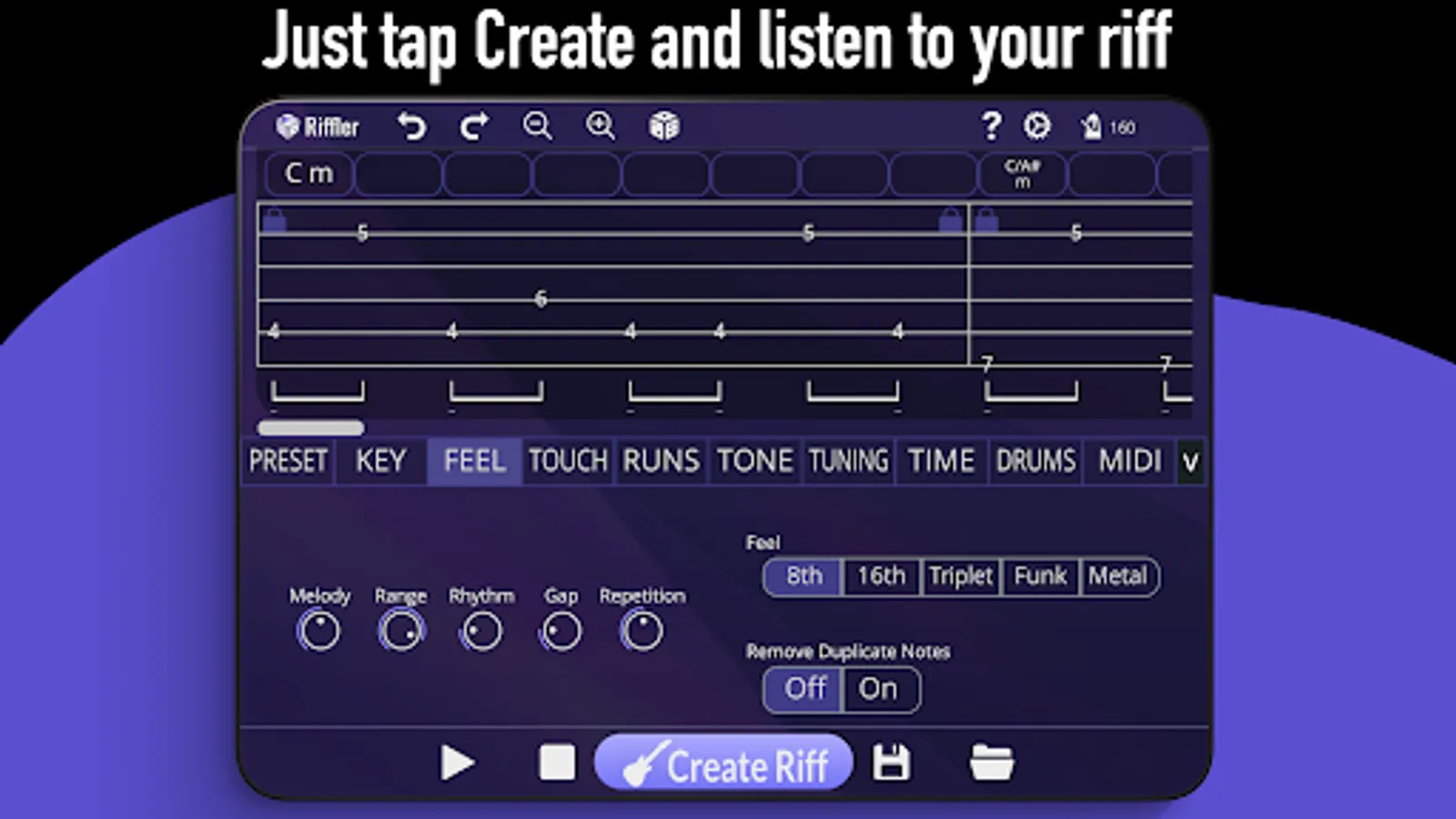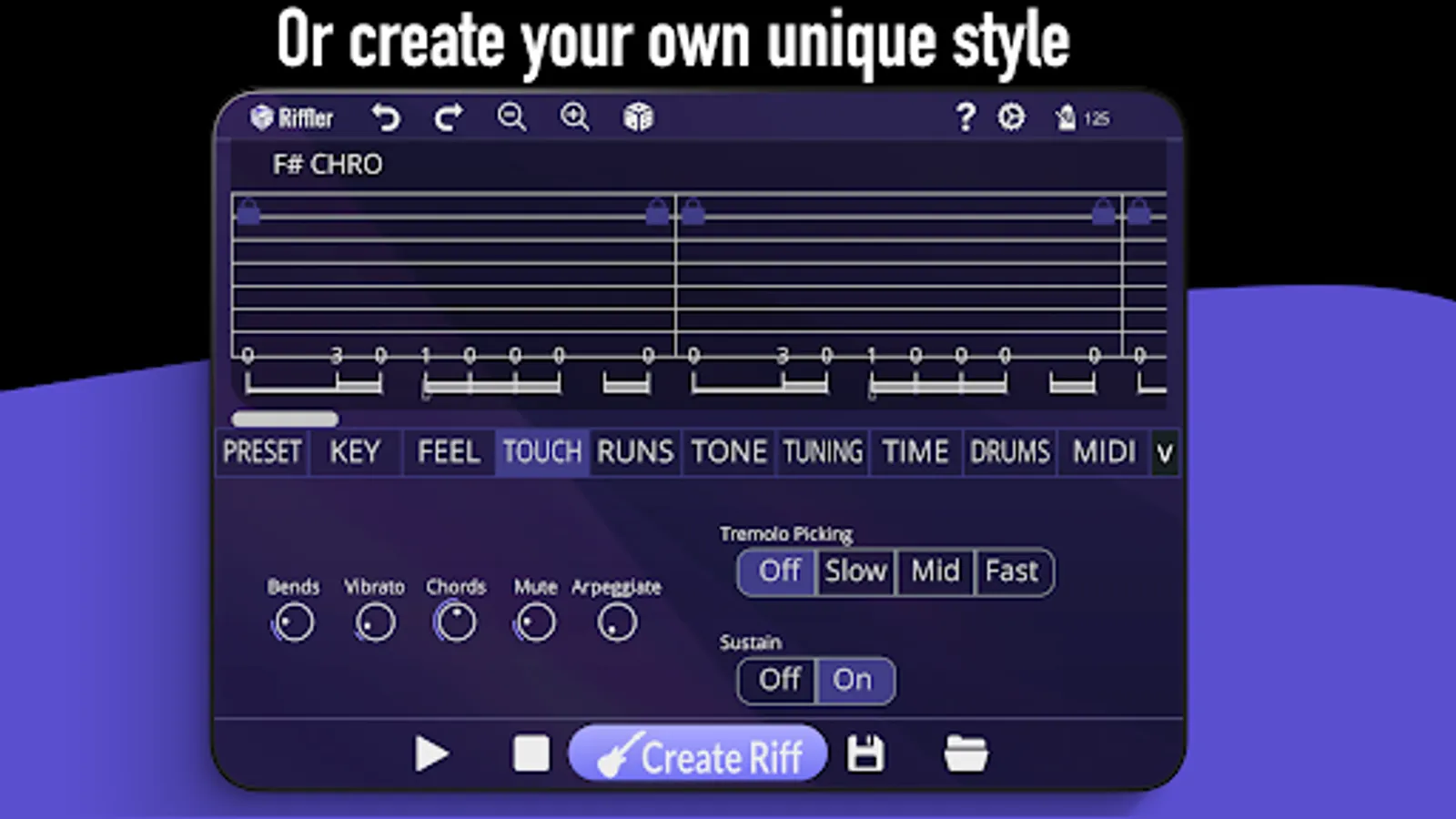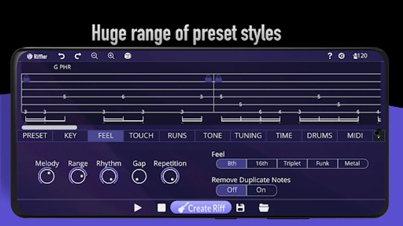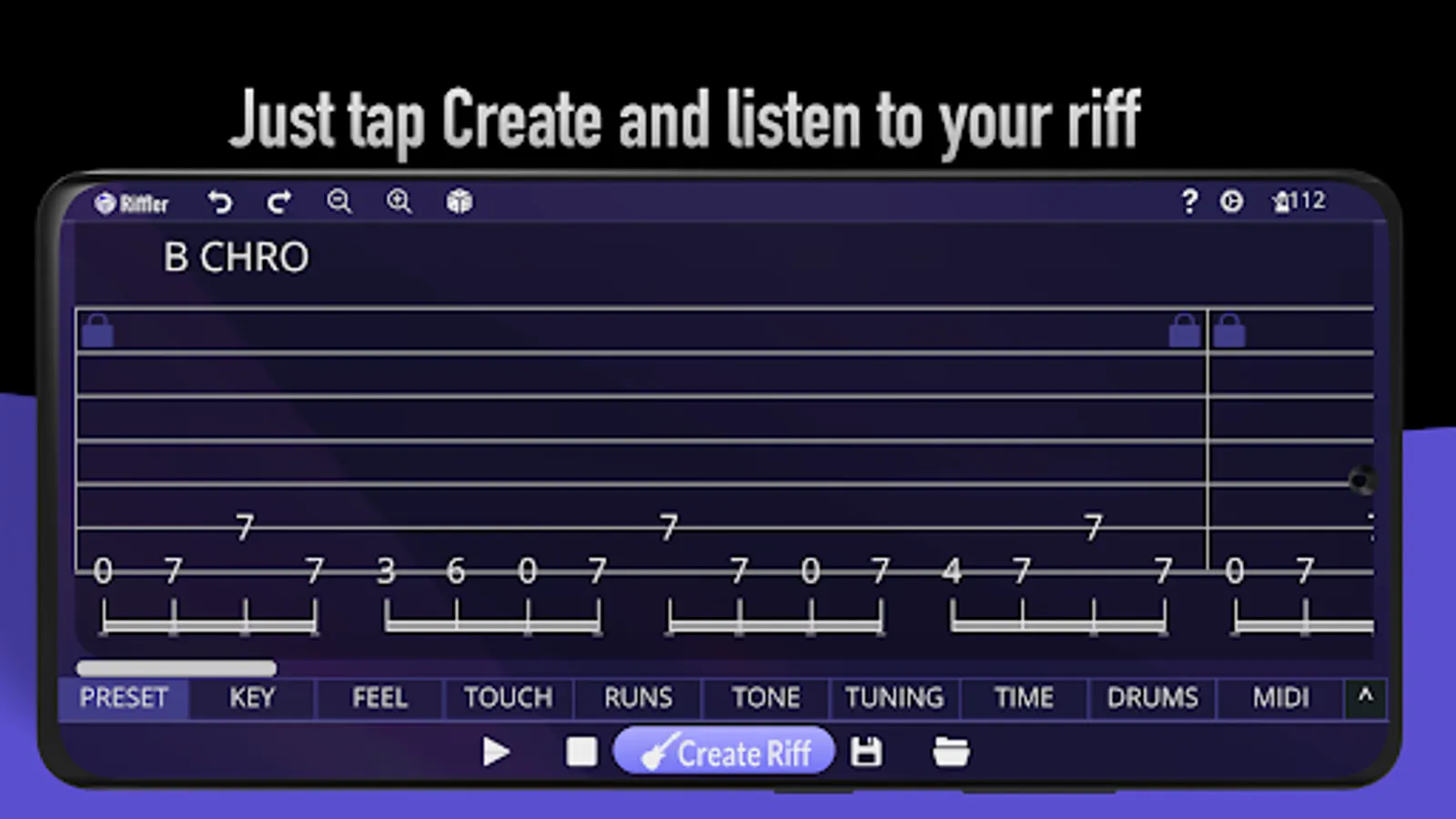 The easiest way to get started is to select from the huge list of preset musical styles, tap "Create", and a unique guitar riff will be made. The created riff is displayed as guitar tablature which you can listen to and save.