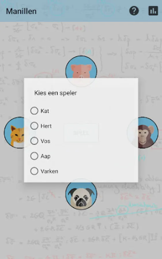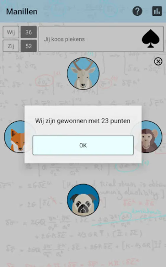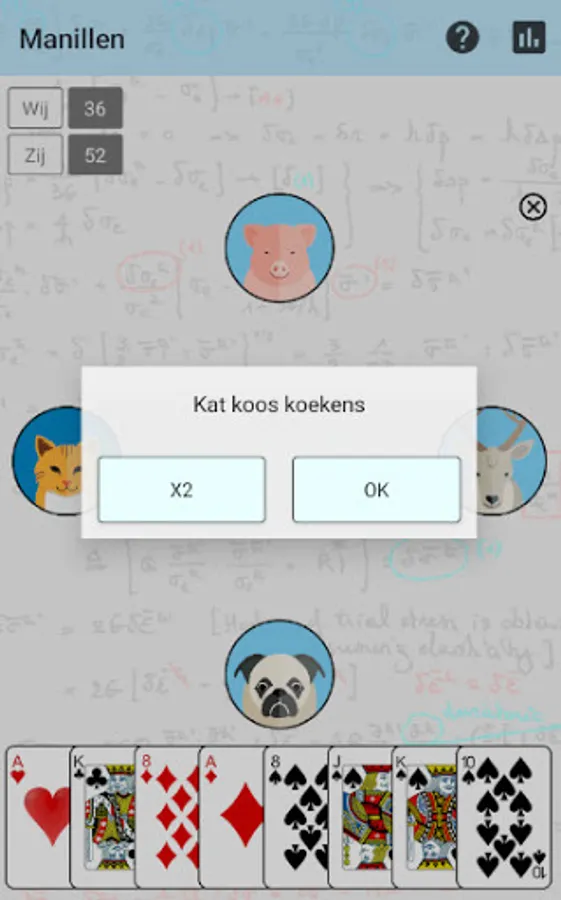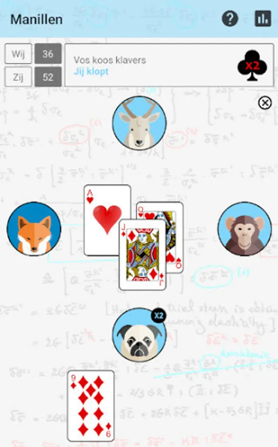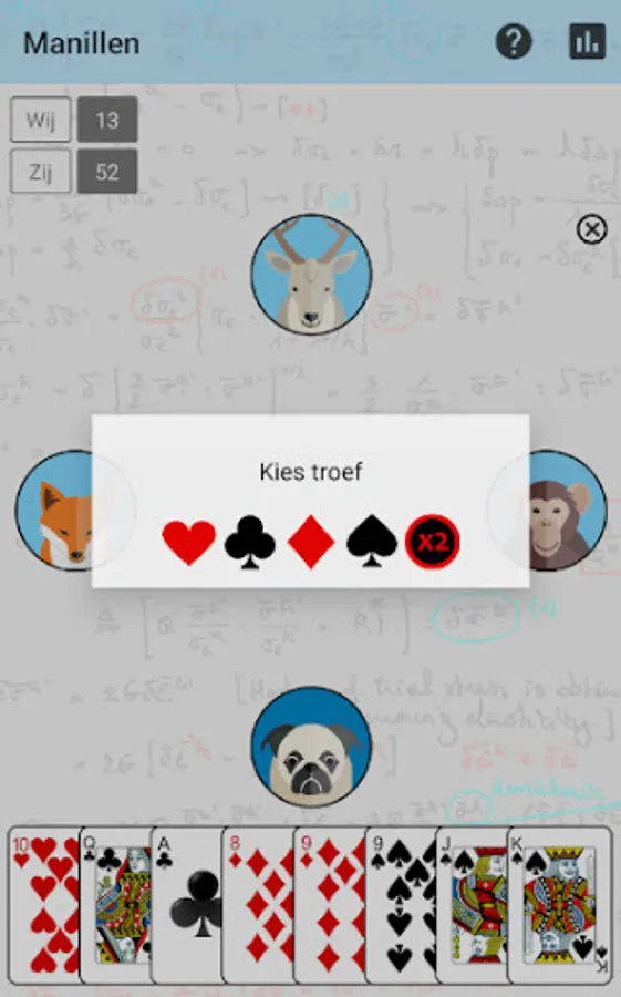 Manillen is a popular card game for 4 people. It is played with 32 cards: the cards from 2 to 6 are not counted. Special is that the 10 is the highest card, we call this the manille. Then follow Ace, King, Queen, Fool, 9, 8 and 7.