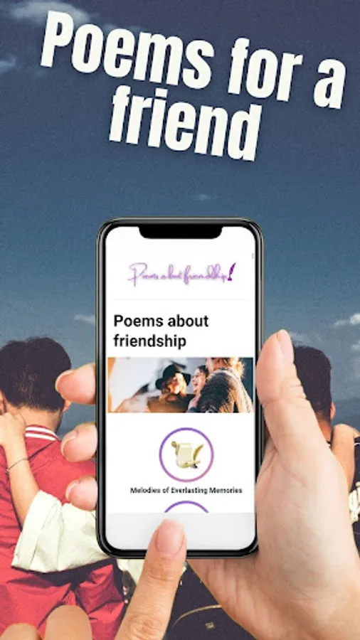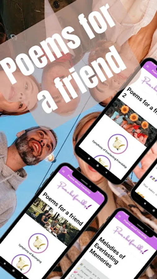 Download now our application of Poems about friendship and discover how words can weave indelible bonds of affection and complicity. Turn poetry into a gift for your friends and share unforgettable moments together. Immerse yourself in the power of friendship through the beauty of poetry!"