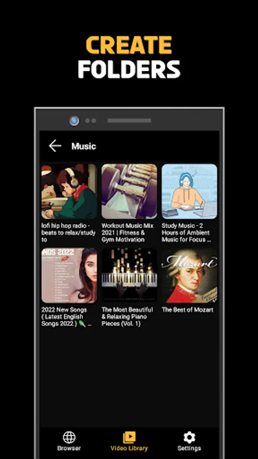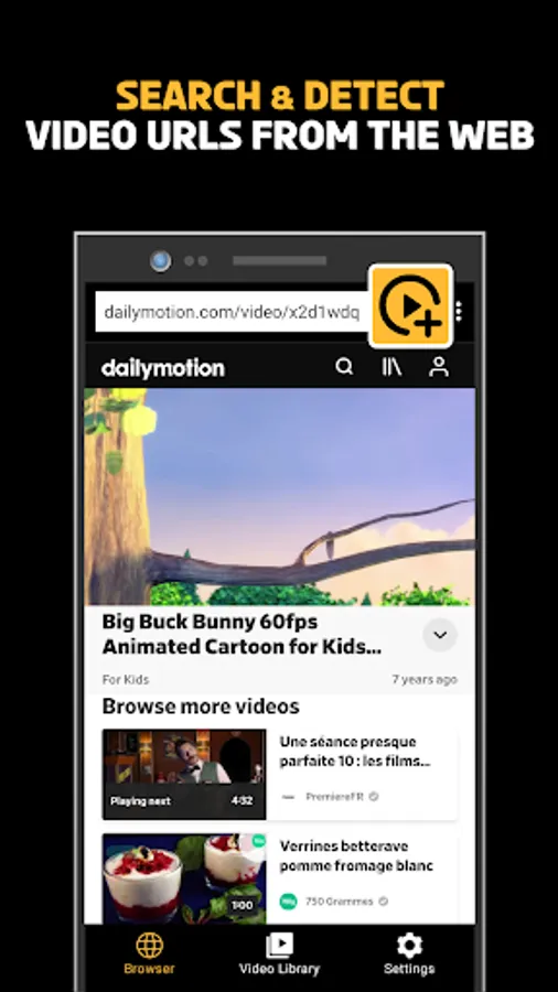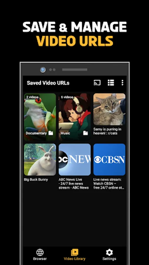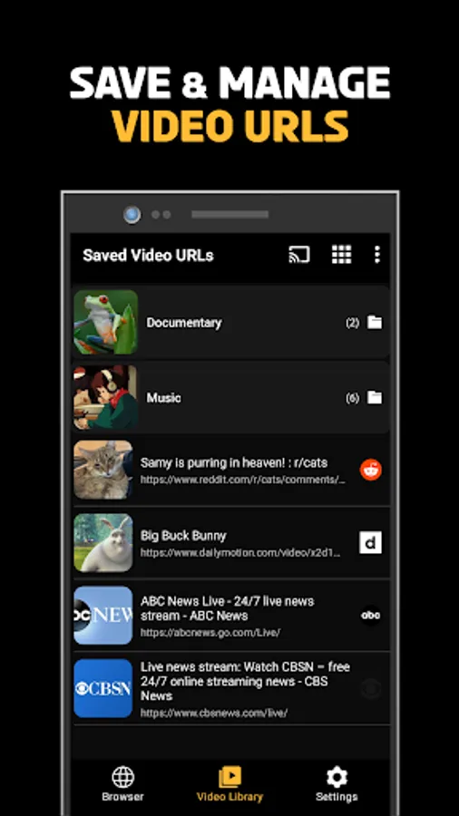 Search for and extract video URLs from the web/internet using the browser. The browser will automatically detect video URLs on websites containing videos. You can then save these video URLs inside the app's video library.