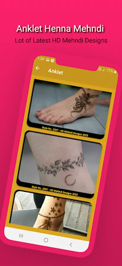 This app also contains mehndi designs for stomach/belly, anklet, shoulder, leg and back. Simple mehndi designs and tattoos especially for men to enjoy parties with mehndi designs.